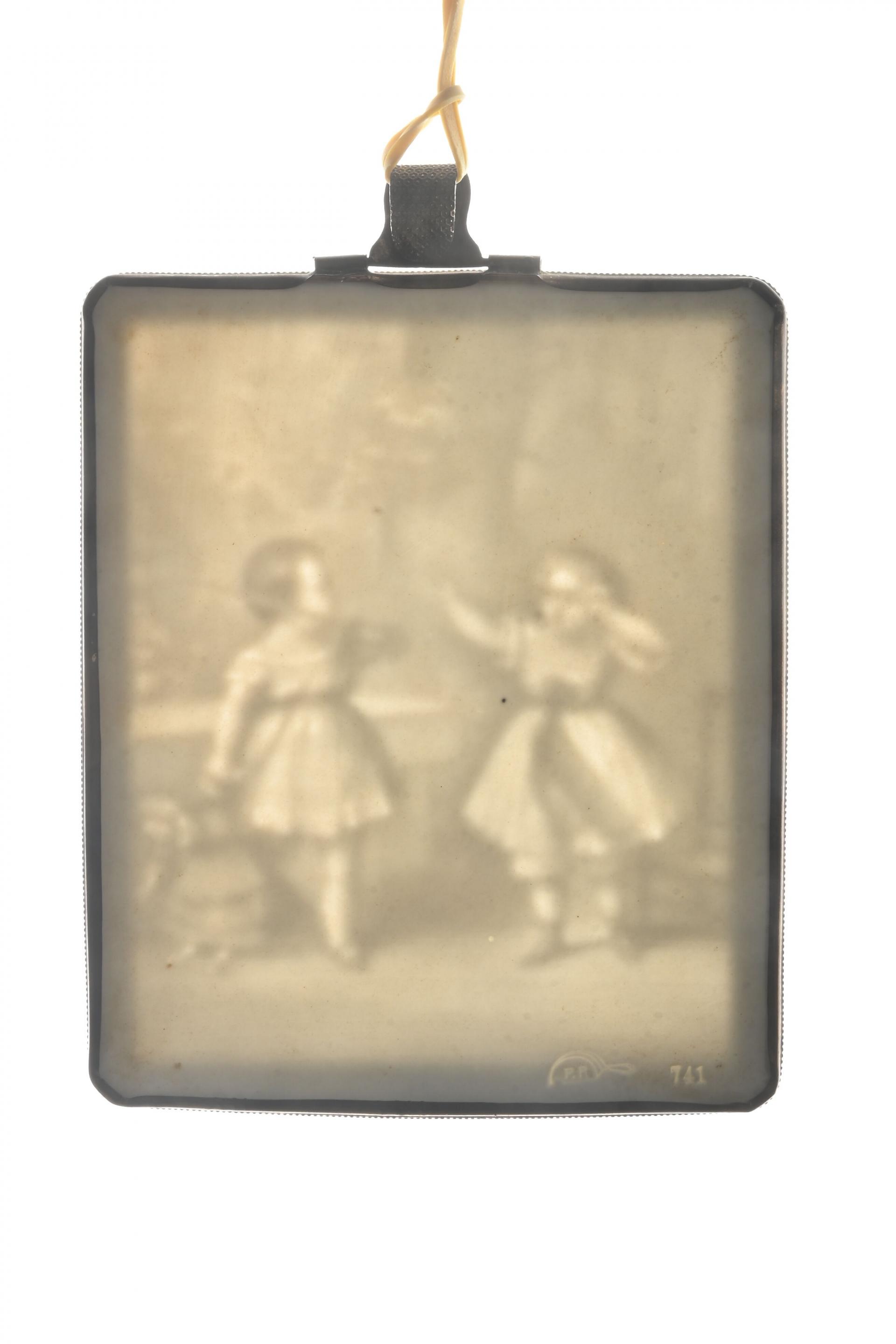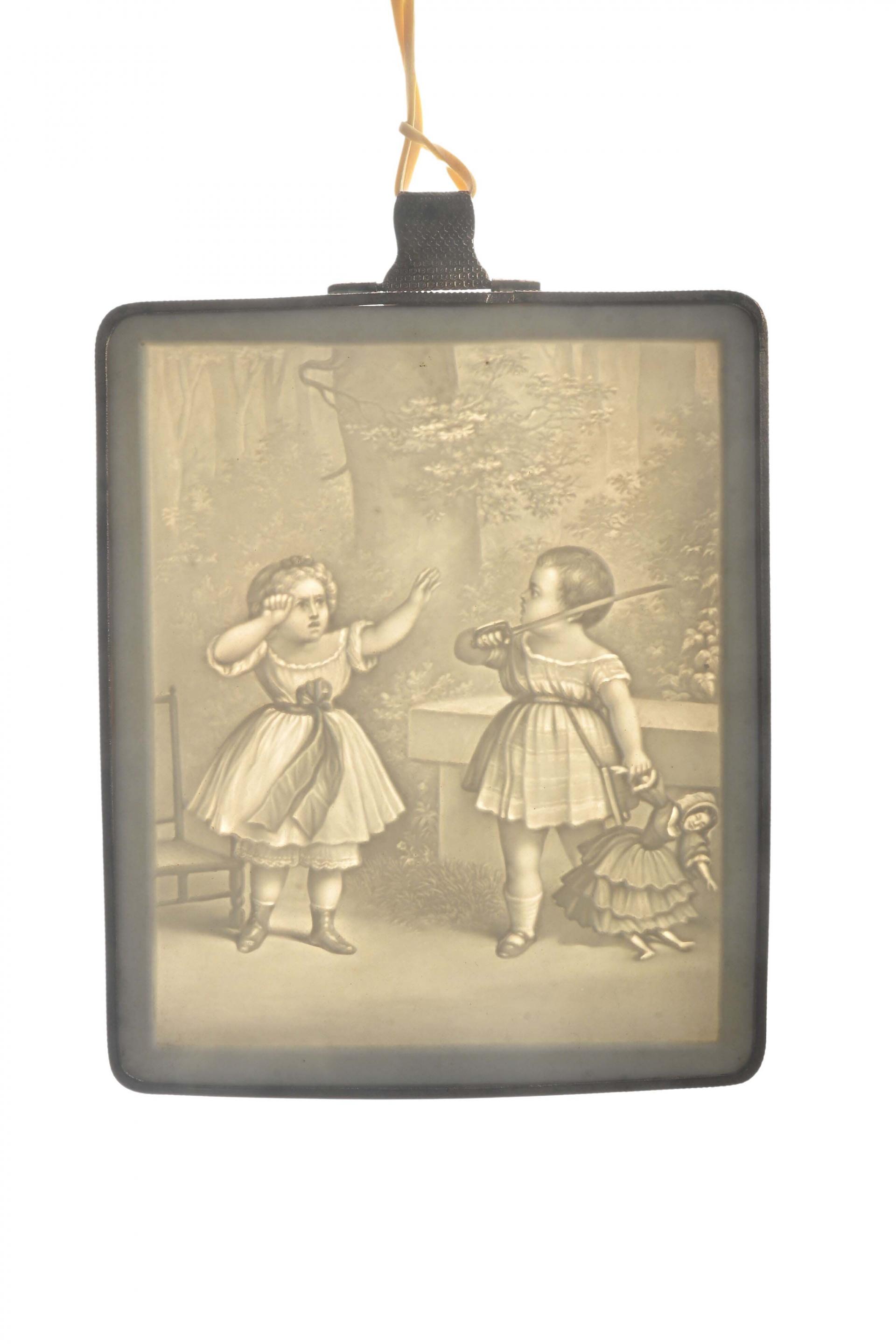 Enfants se disputant une poupée Lithophanie cerclée de métal doré. 13,5 x 11 cm.