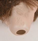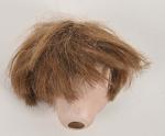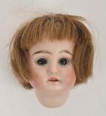 Petite tête allemande en porcelaine, bouche ouverte, yeux fixes bleus, marquée 8/0, perruque. 7 cm.