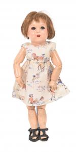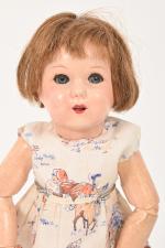 marquée en creux "2", bouche ouverte avec langue et deux dents dans le haut, yeux bleus dormeurs avec cils, corps tout articulé (usures et écaillures), pieds "1", robe, perruque. 29 cm.
