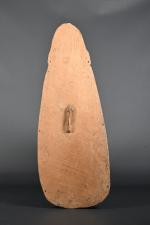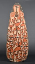 Bouclier en amande, surmonté d'un masque, et orné de motifs évoquant les grandes roussettes frugivores, symboliquement associée à la chasse aux têtes.