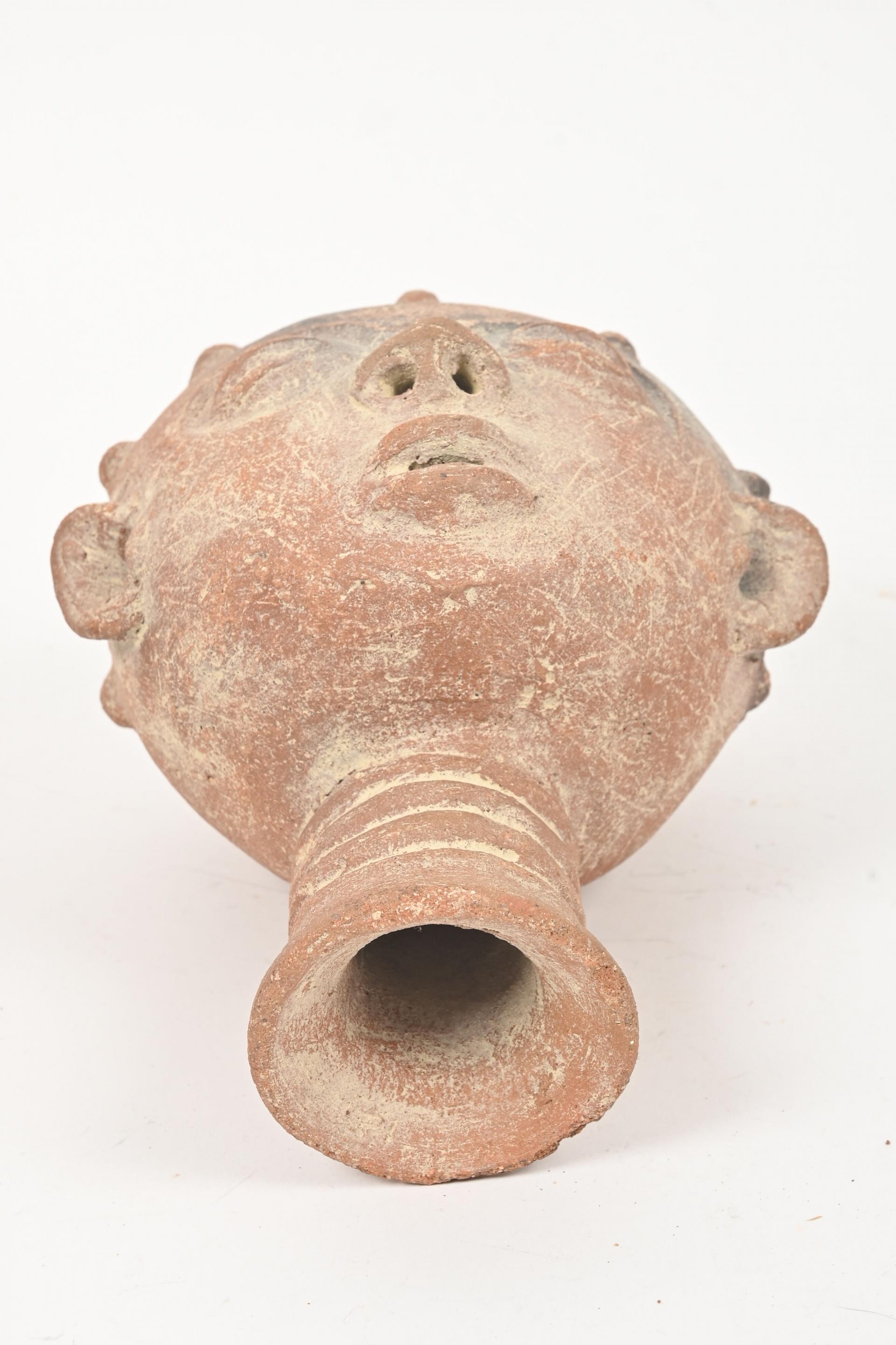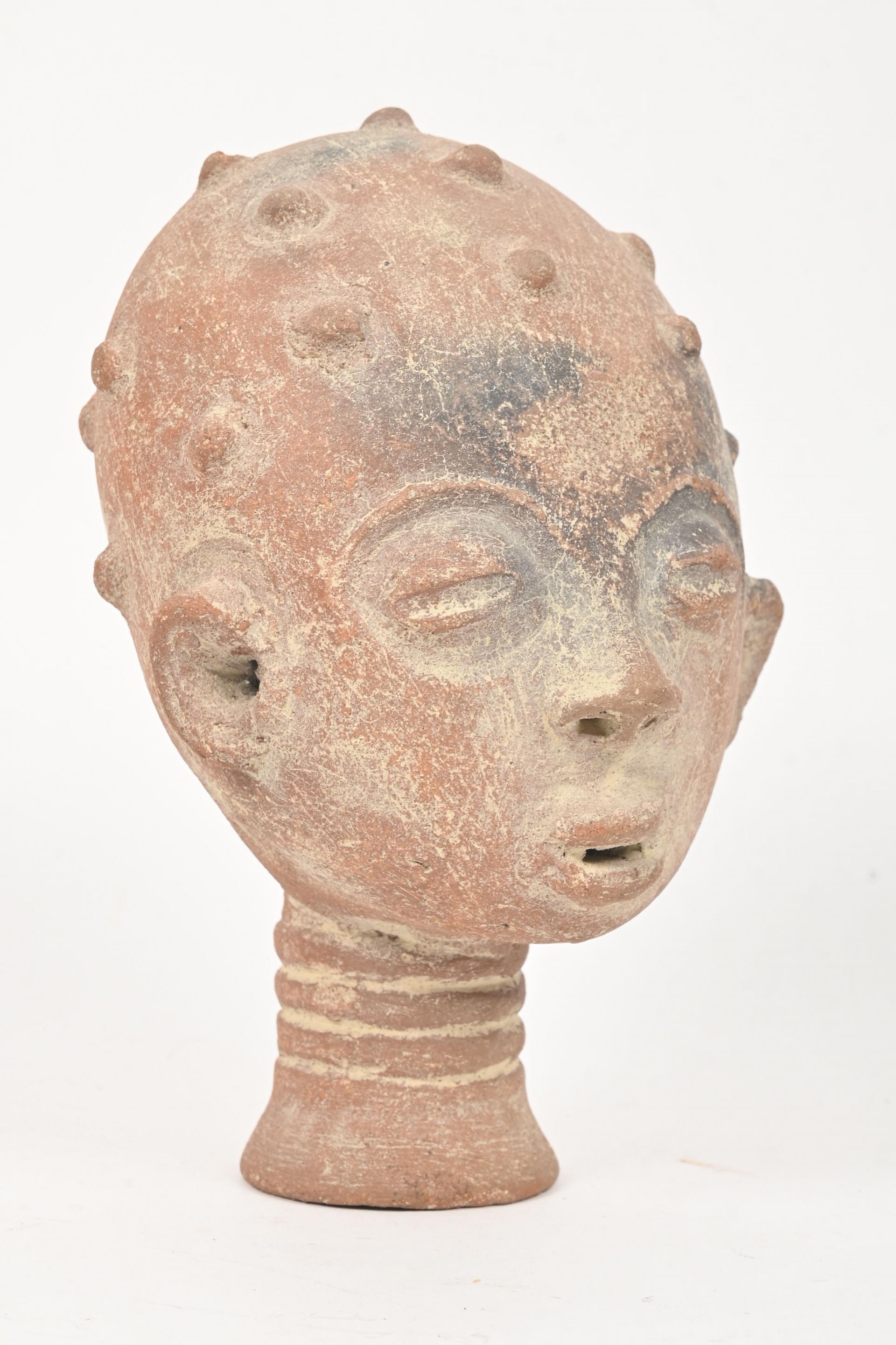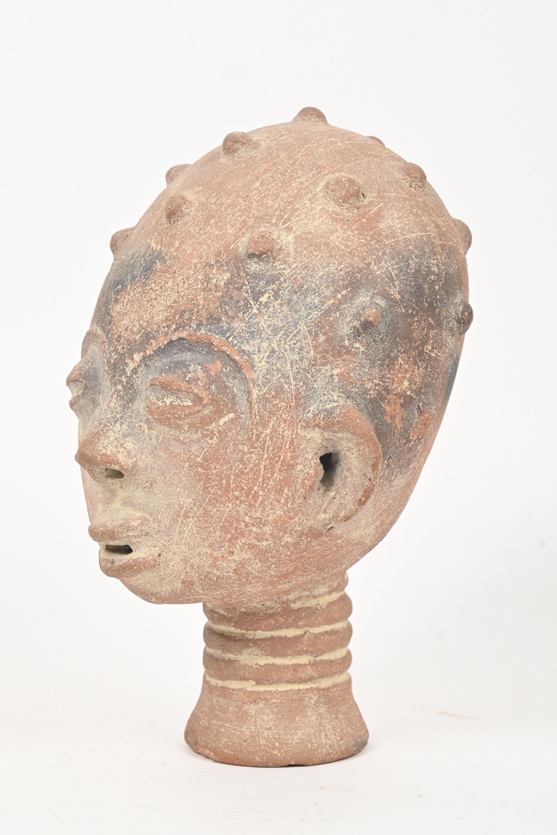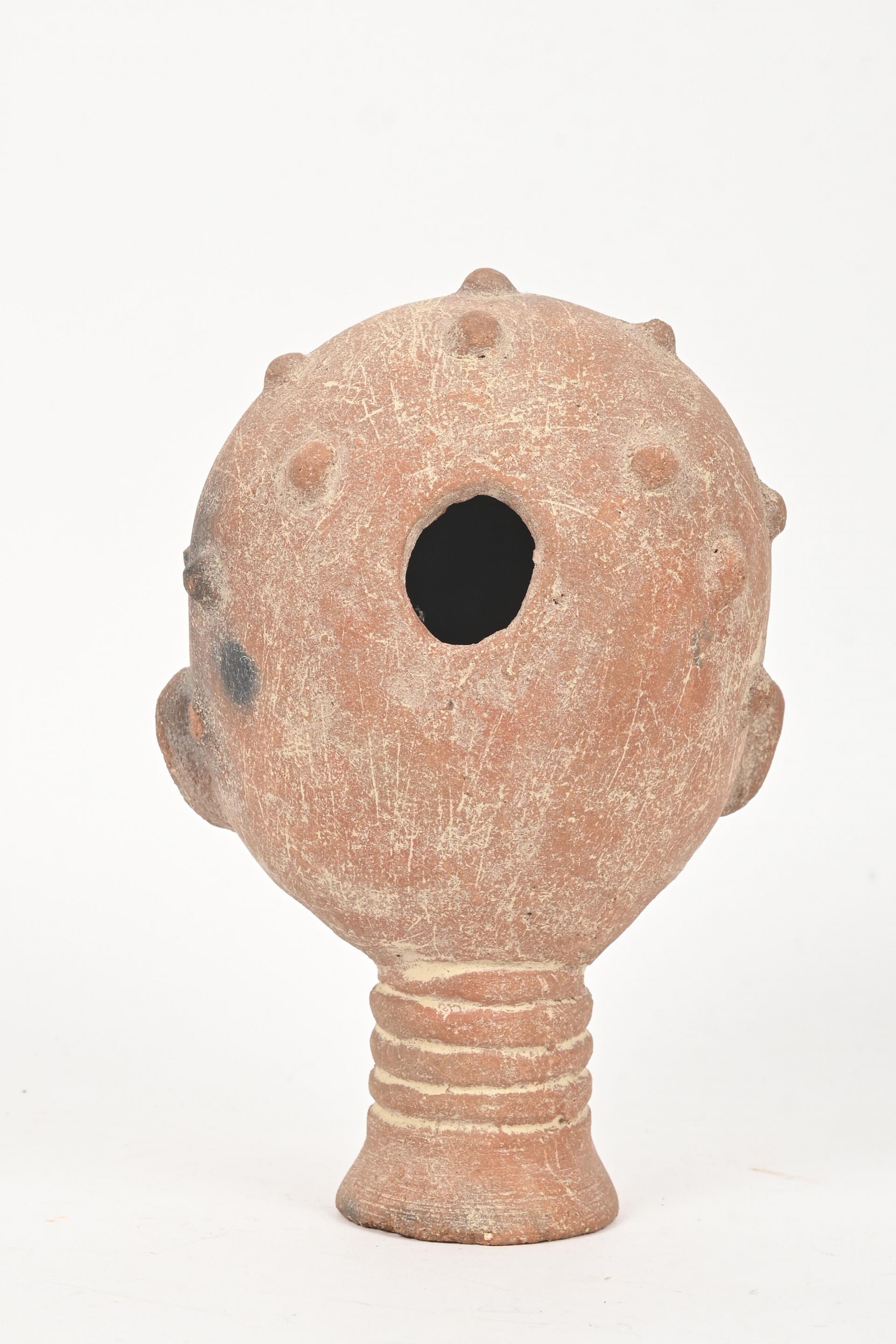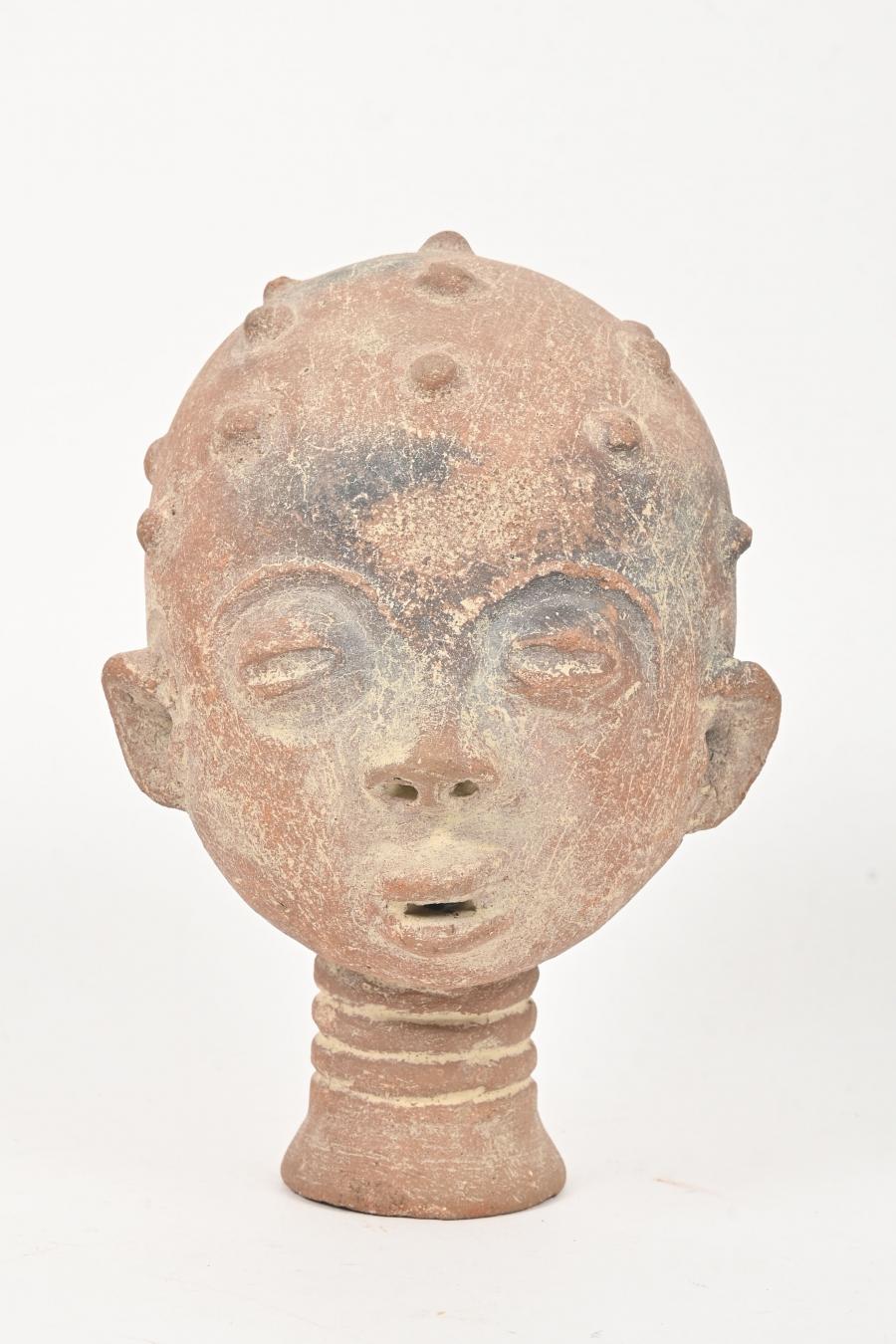 Terre cuite à engobe ocre rougeTête funéraire « Nsodia », portrait d'une femme illustre défunte, les yeux clos en grain de café, la bouche entrouverte, le ou annelé et la coiffure à petites boucles. Déposée sur le sanctuaire « Mmaaso », elle affirmait la continuité du lignage.