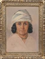 Émile DECKERS (1885-1968) Portrait de berbère au collier, Alger 1941 Huile sur panneau Signée, située et datée en bas à gauche 52 x 38 cm. Beau cadre orientaliste (Salissures au tableau) Expert : Cabinet Chanoit