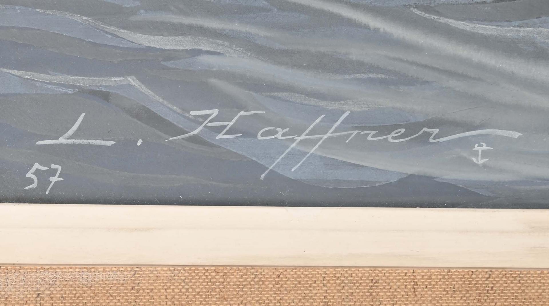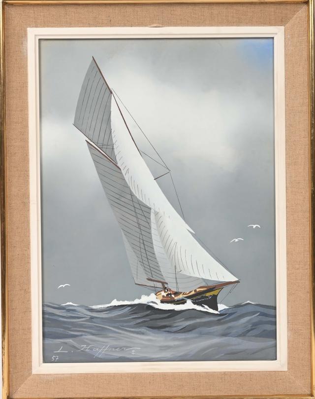 Léon HAFFNER (1881-1972) Voilier en mer Gouache au pochoir Signée et numérotée 57 en bas à gauche. A vue : 43 x 31 cm.