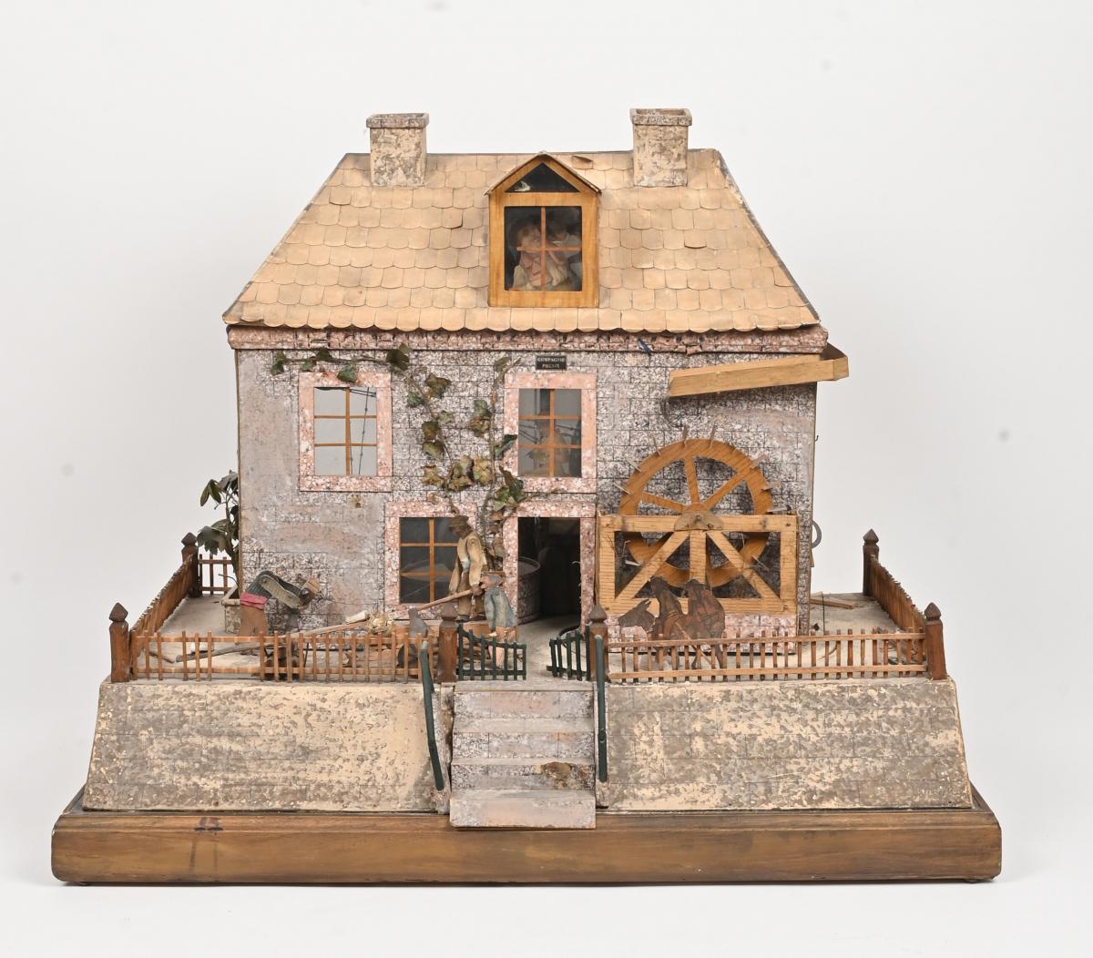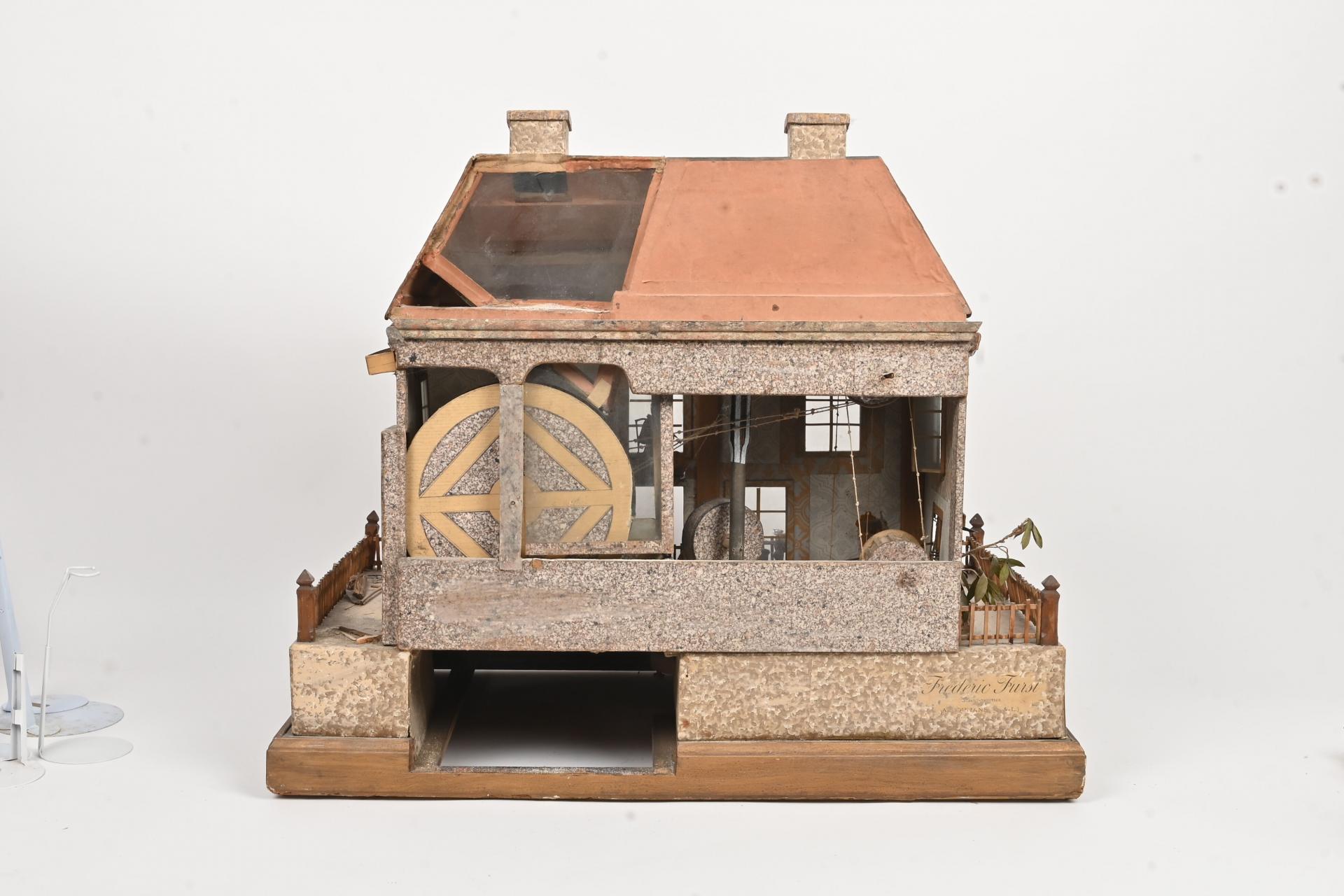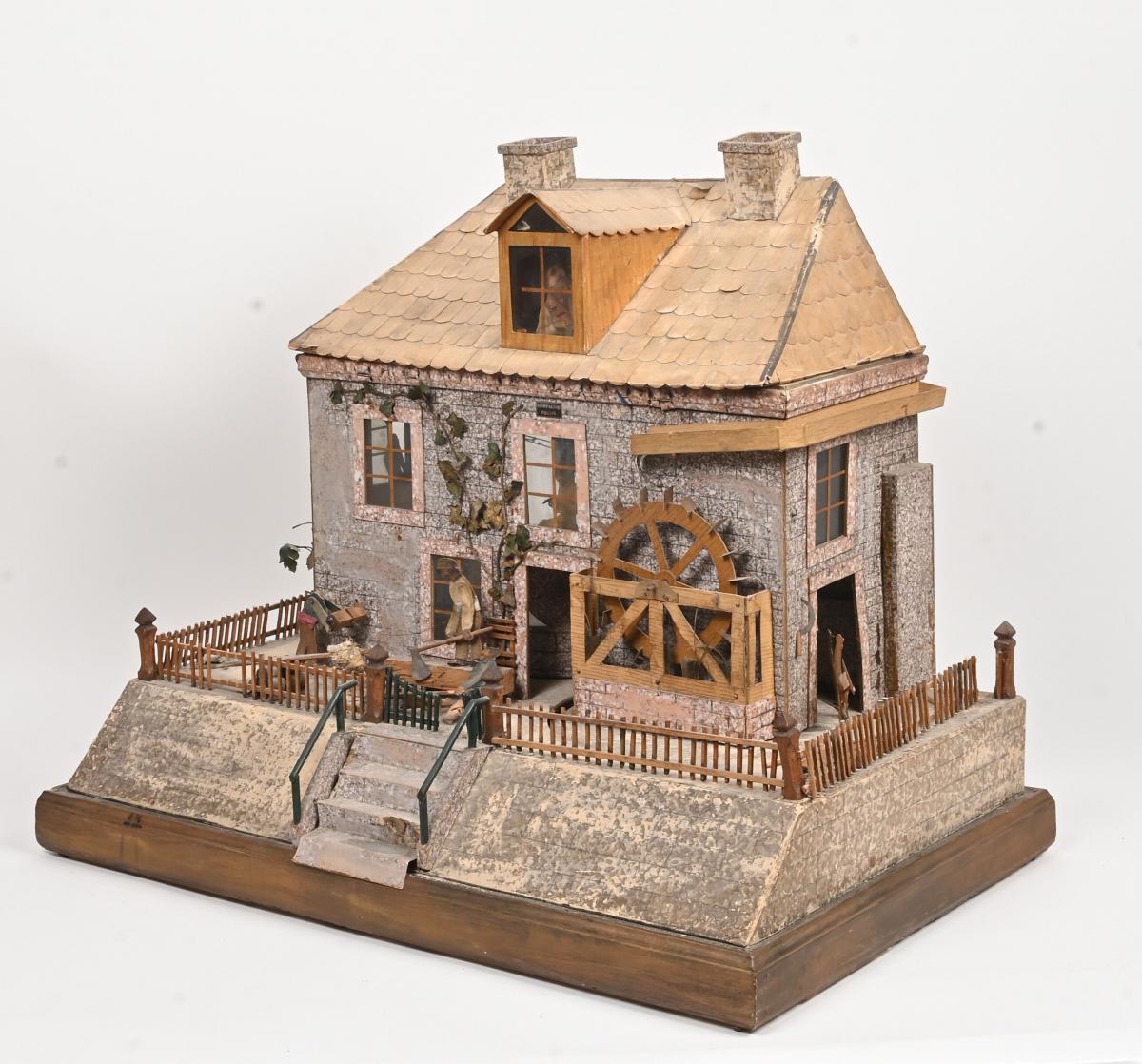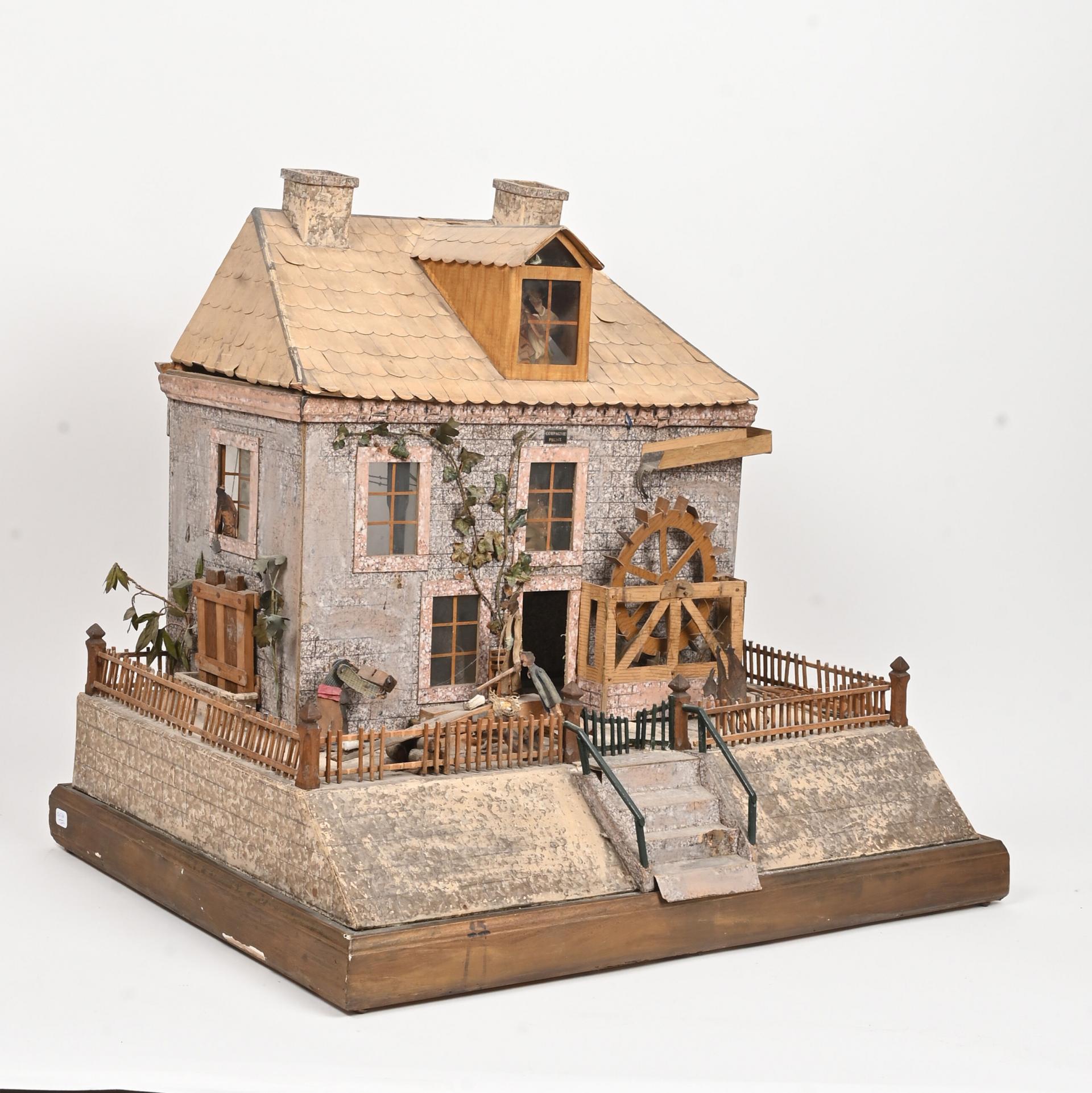 Grande maquette animée en bois, carton et papier. Dans le toit réserve de sable qui s'écoule dans une roue entraînant sept animations : meule, bucheron, roue à aubes... En état grenier. Nécessite une remise en état. Porte une étiquette "Frédéric Furst" - Reliure papetier à Louhans (S et L) et au crayon "1894". Intéressant document de travail du Jura. 62 x 41 cm. H. 64 cm.