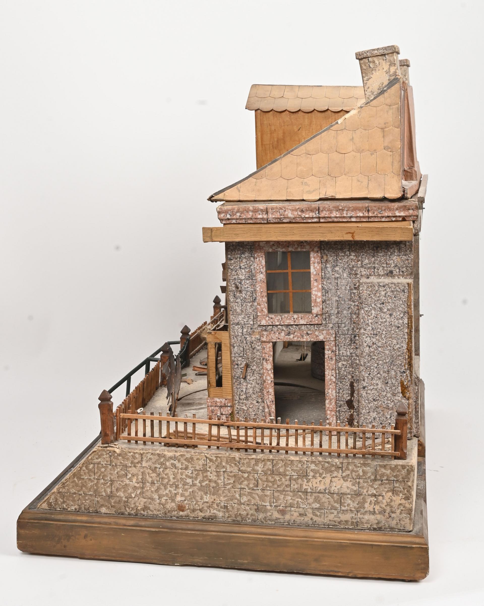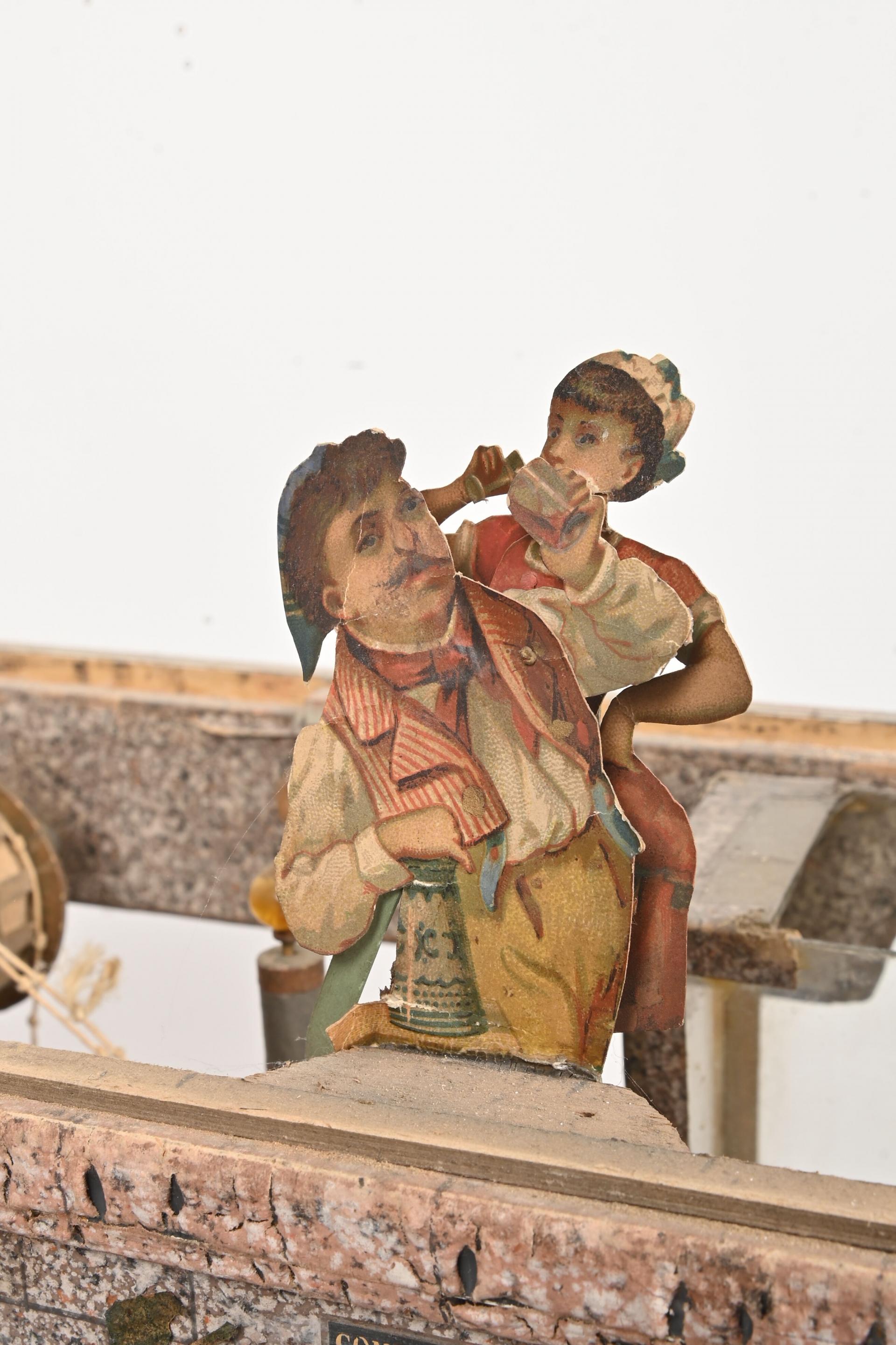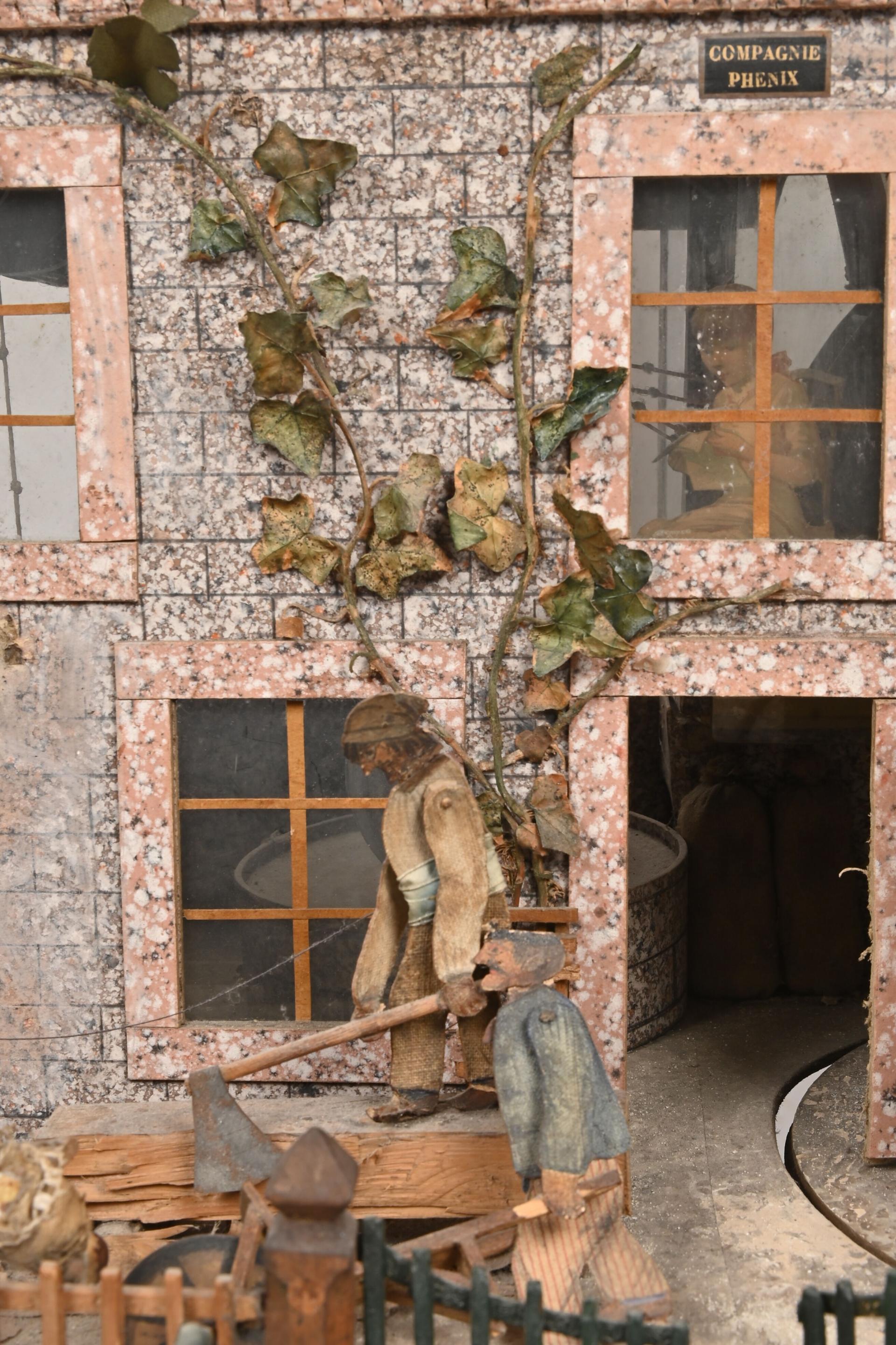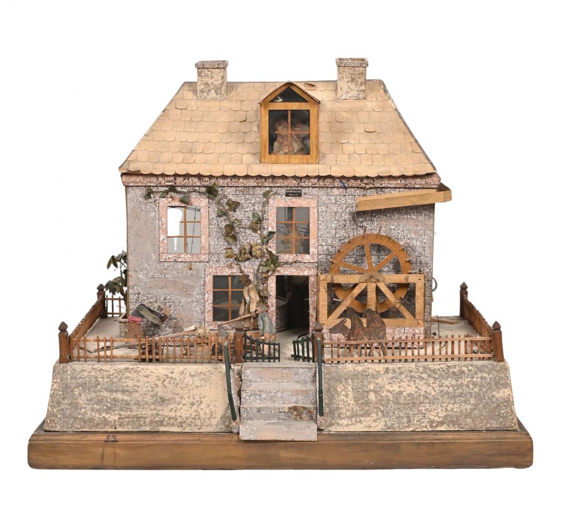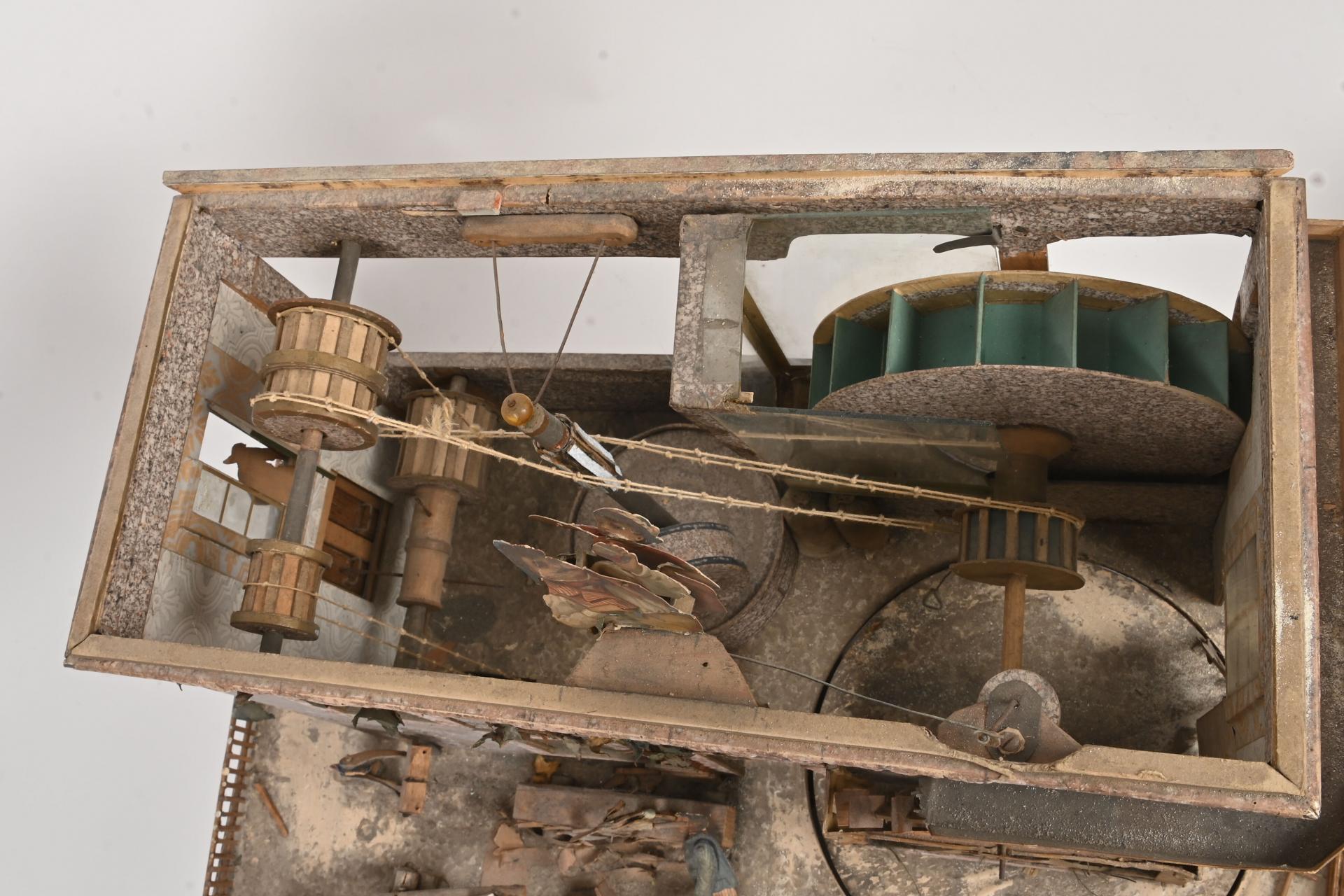 Grande maquette animée en bois, carton et papier. Dans le toit réserve de sable qui s'écoule dans une roue entraînant sept animations : meule, bucheron, roue à aubes... En état grenier. Nécessite une remise en état. Porte une étiquette "Frédéric Furst" - Reliure papetier à Louhans (S et L) et au crayon "1894". Intéressant document de travail du Jura. 62 x 41 cm. H. 64 cm.