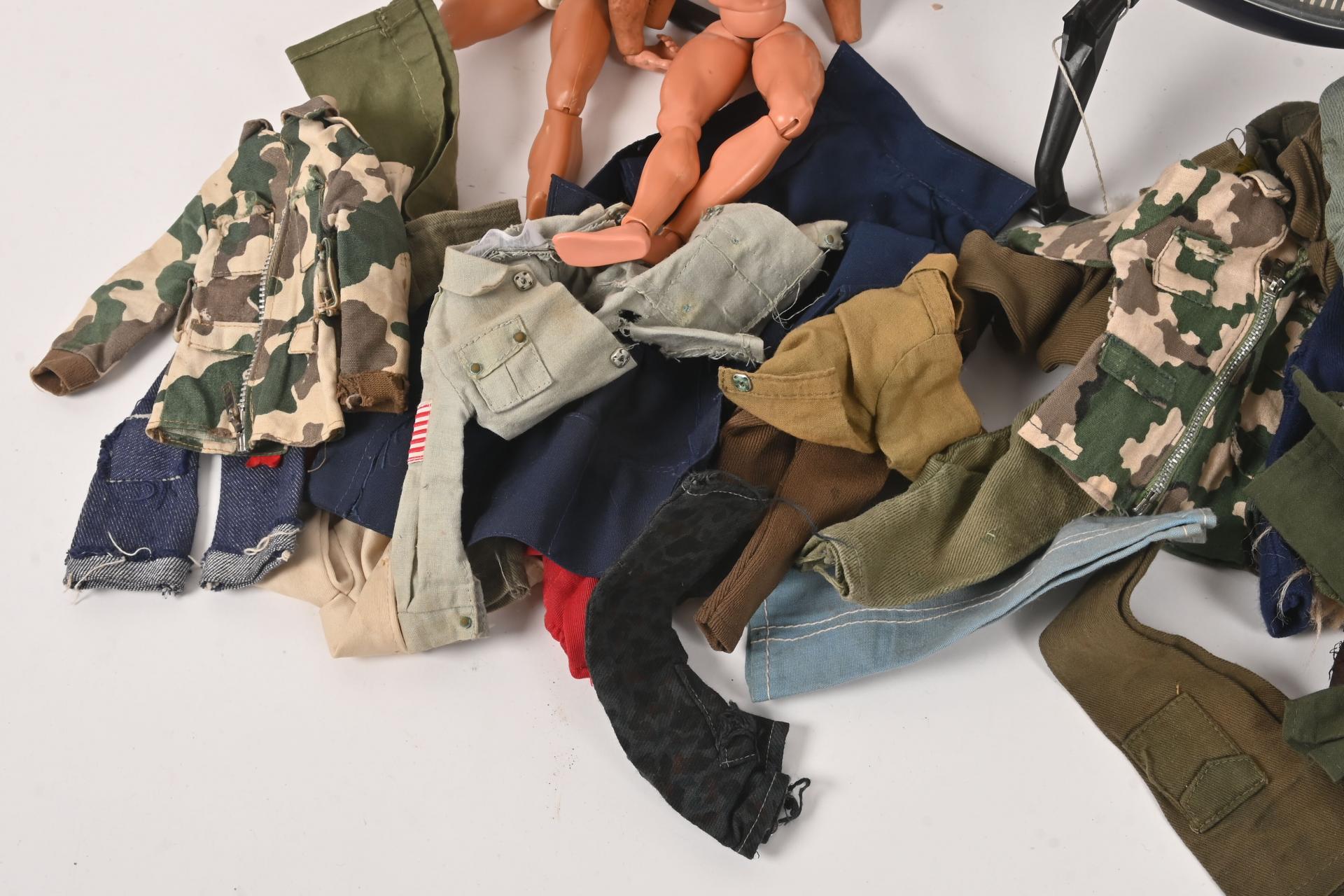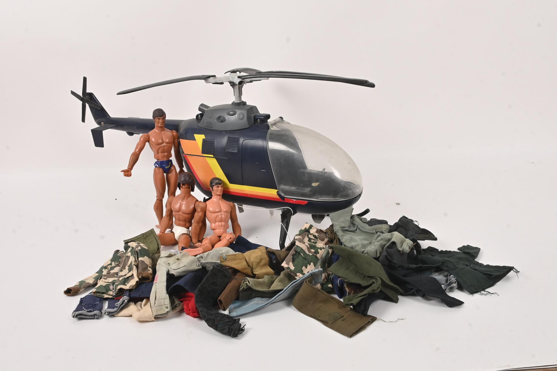 Mattel et Hasbro, Big Jim / Action Joe, véhicules, figurines et accessoires dont hélicoptère, figurines et tenues, années 70, (petites usures).