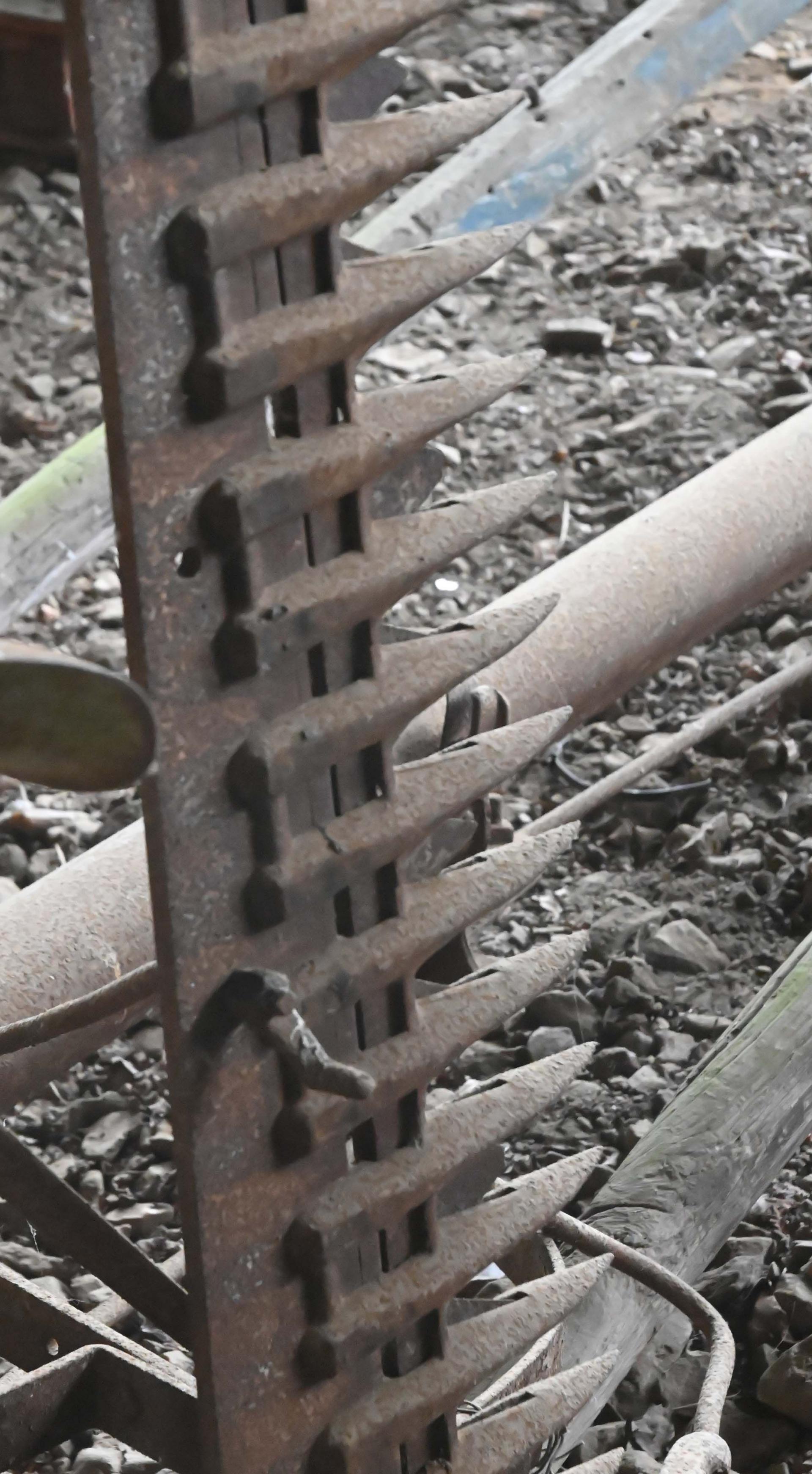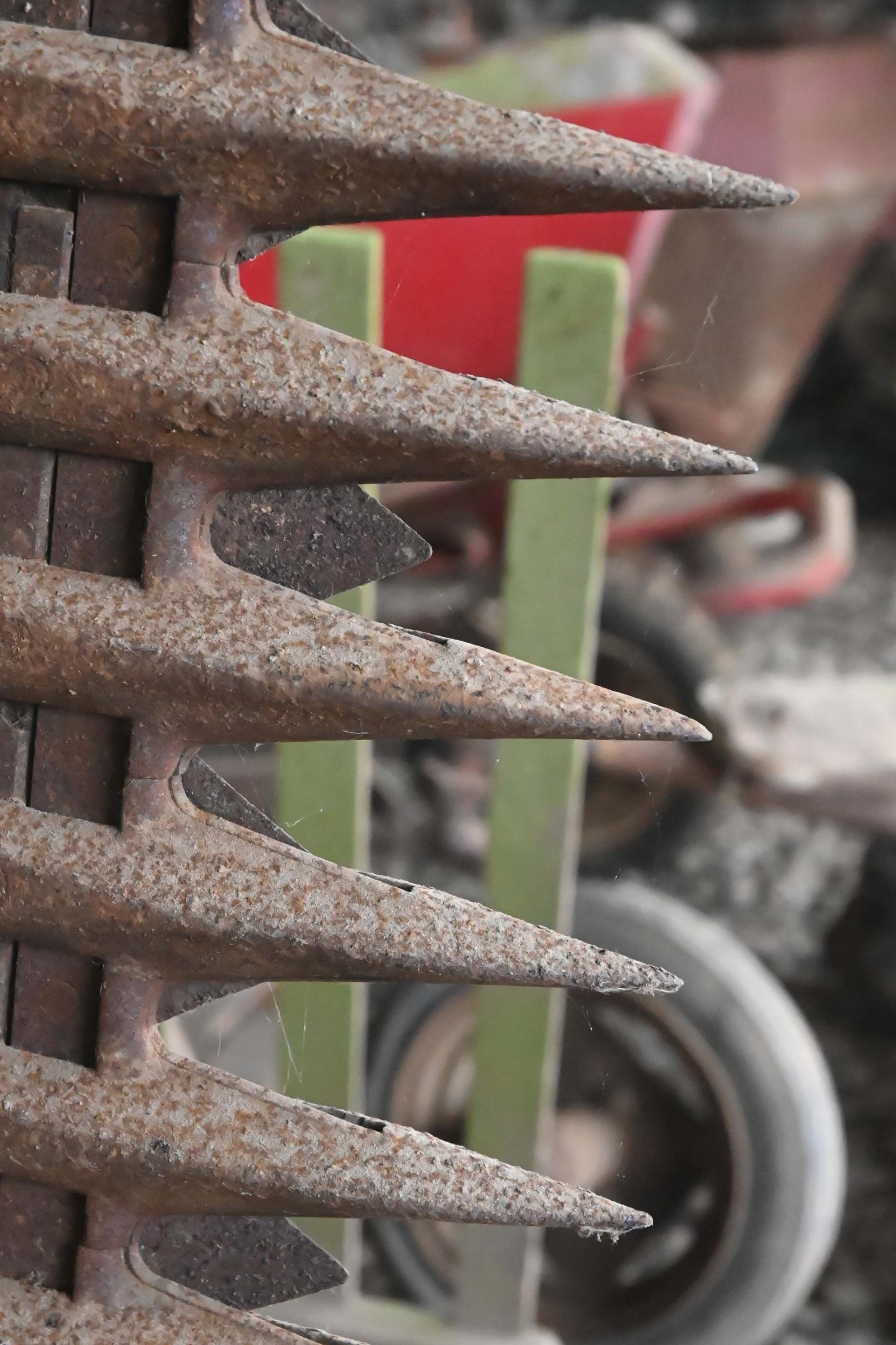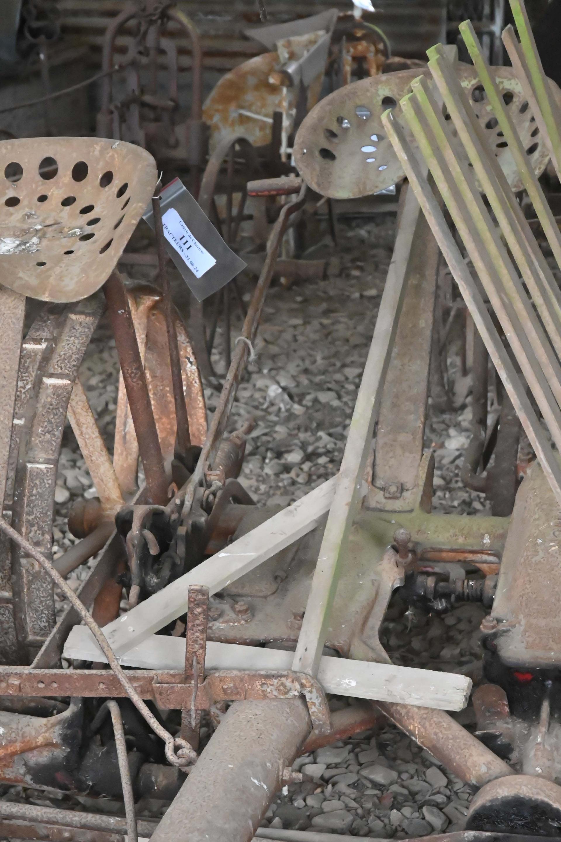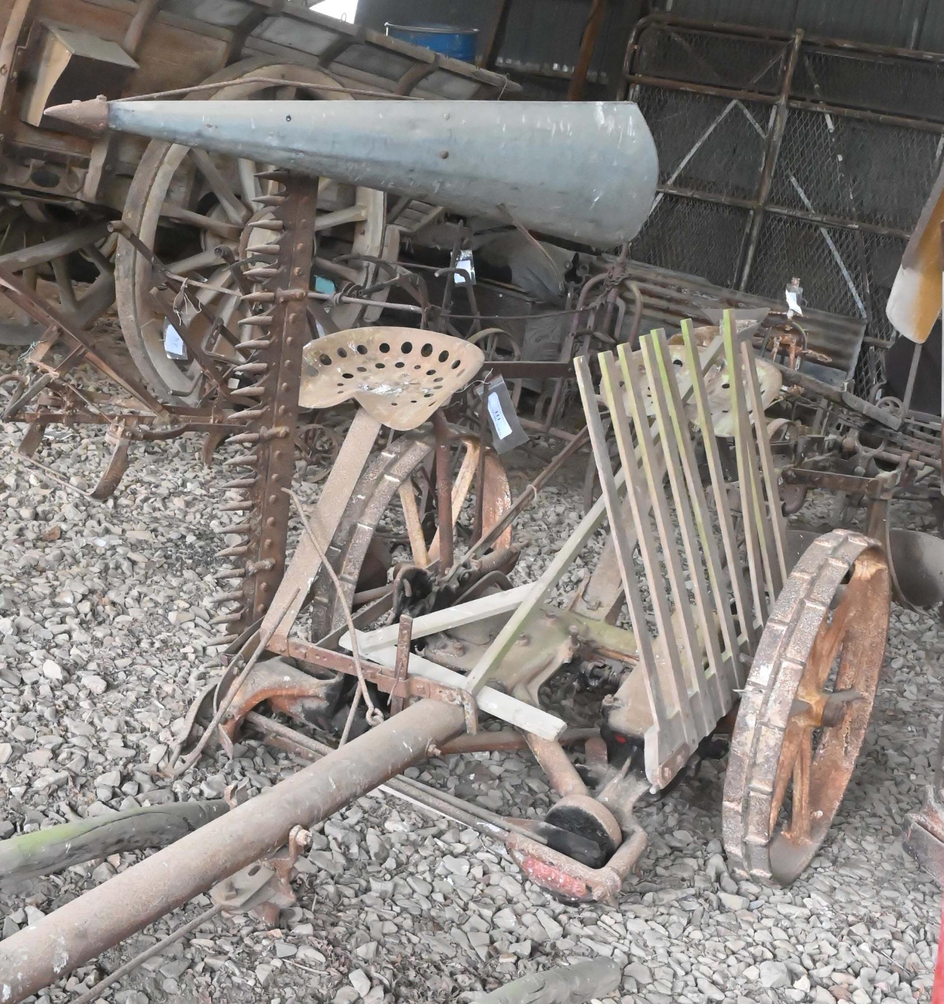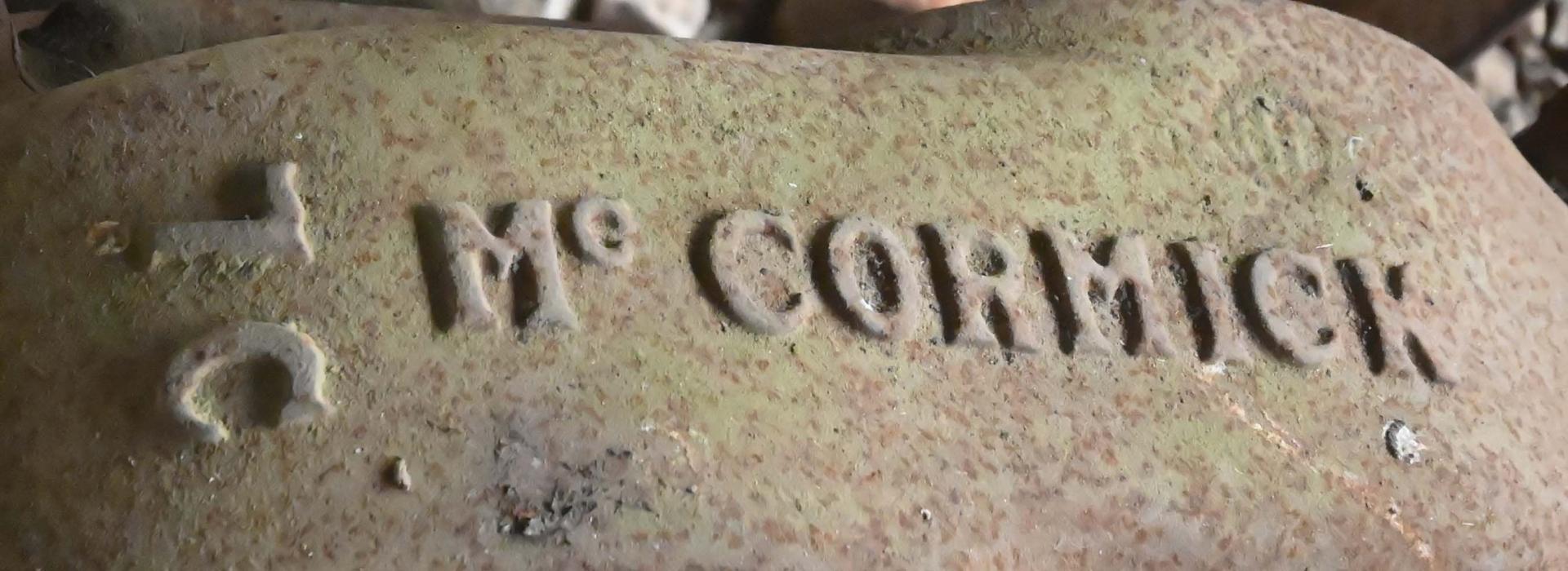 Faucheuse Mc CORMICK 7C, bon état, rouille superficielle, double siège, roulette en bout de barre de coupe, divisuer métal galvanisé, timon tube métal origine attelage cheval, tablier à lattes de réception.
