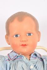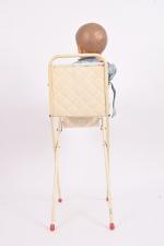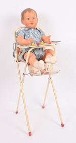 Petitcollin, l'Invincible Grand baigneur en celluloïd, taille 65, yeux acétate bleu. Dans une chaise haute en métal et plastique à décor du Manège Enchantée. H. 75 cm.