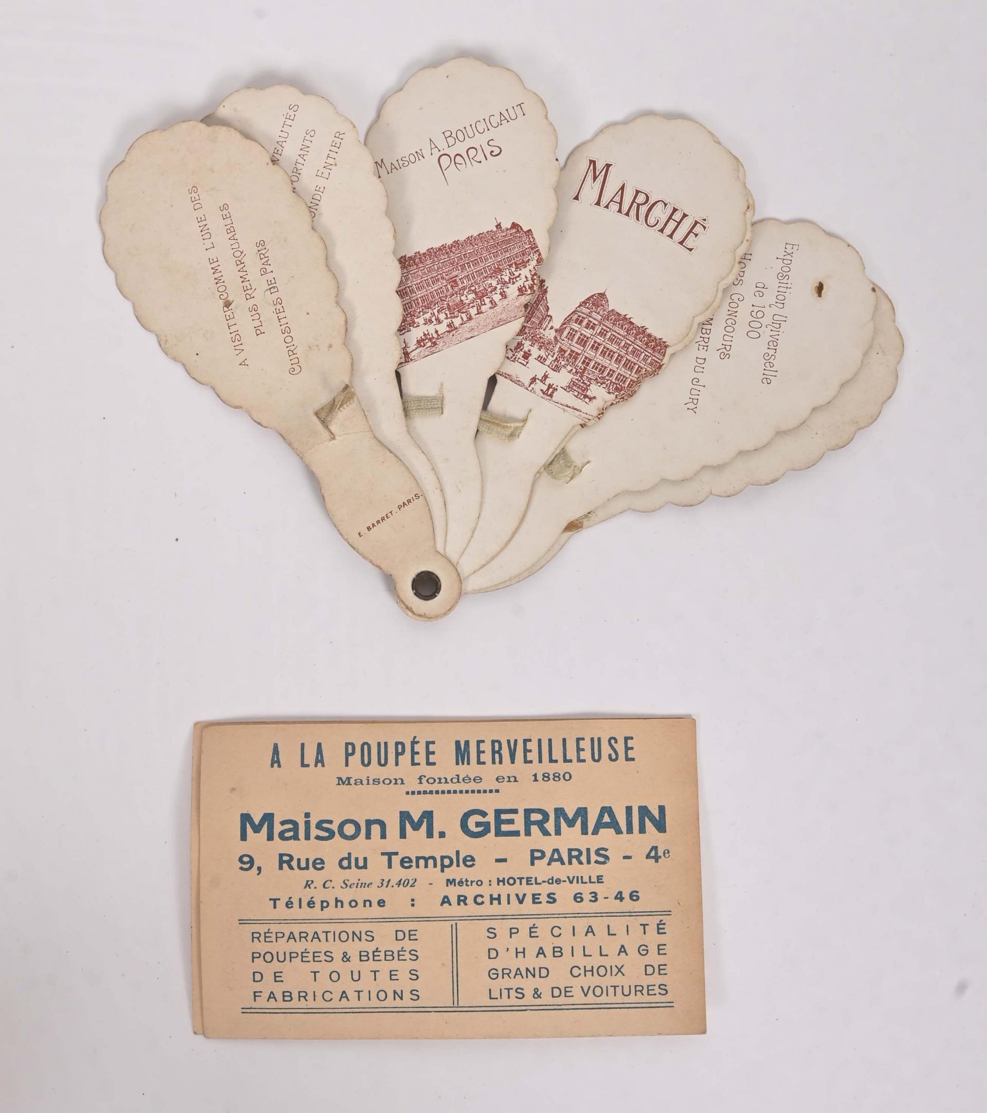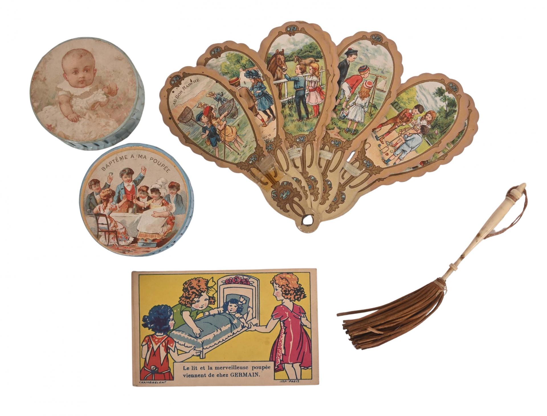 "Baptême à ma poupée" deux boîtes, éventail, martinet et divers.