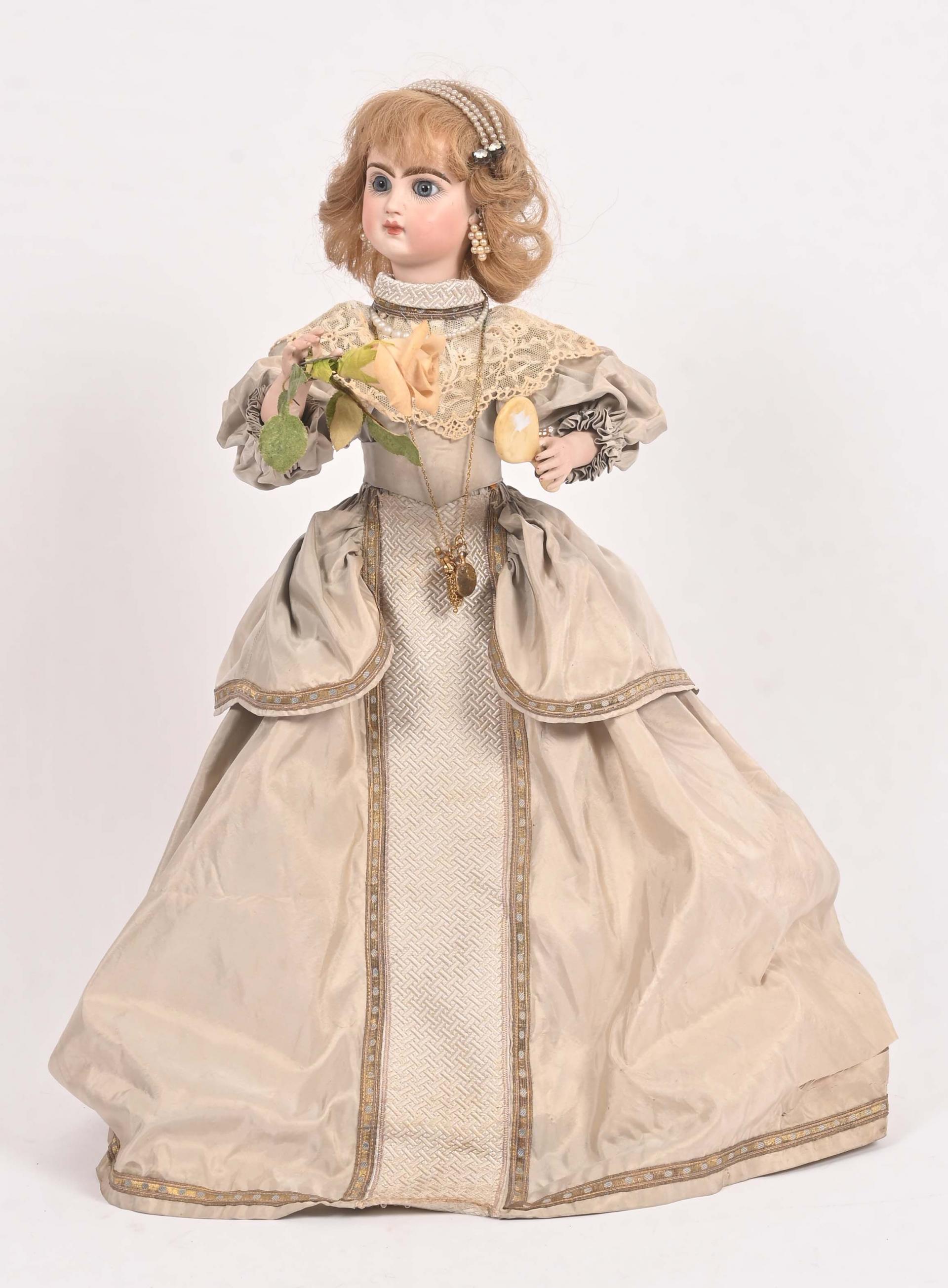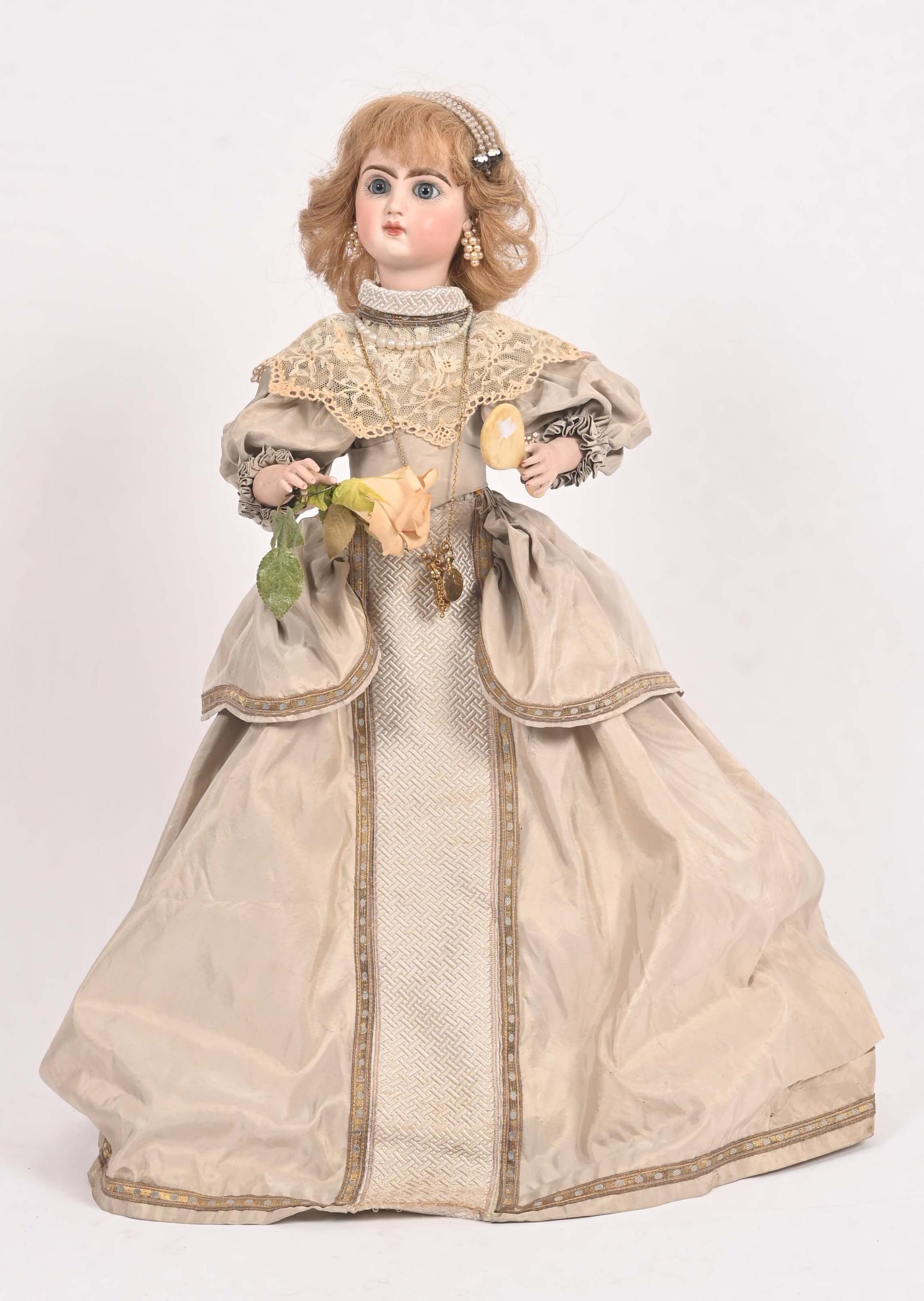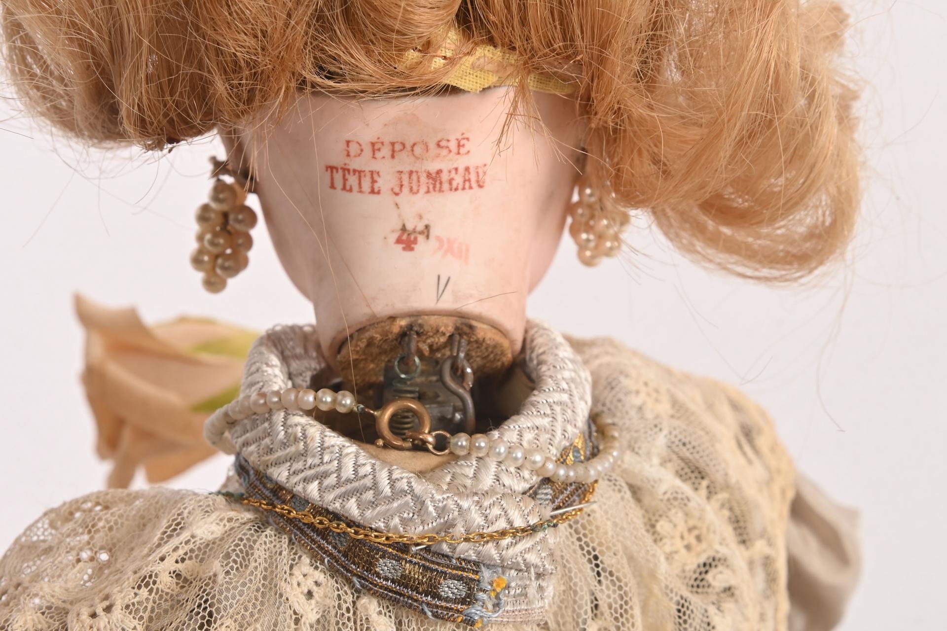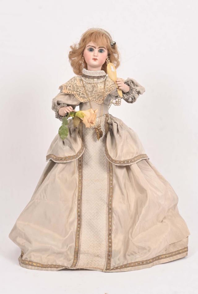 Automate à tête Jumeau, bouche fermée taille 4 marquée au tampon rouge, yeux de sulfure bleu, mains en biscuit (légers accidents à l'une). Beaux mouvements : la tête de gauche à droite et de haut en bas pour sentir la fleur tenue dans la main droite et se regarde dans le miroir tenu dans la main gauche. Mouvement des deux bras. Socle avec mécanisme et musique. Clé LB. Sous-vêtements d'origine, habit refait avec grande robe en soierie, perruque rapportée. H. 50 cm.