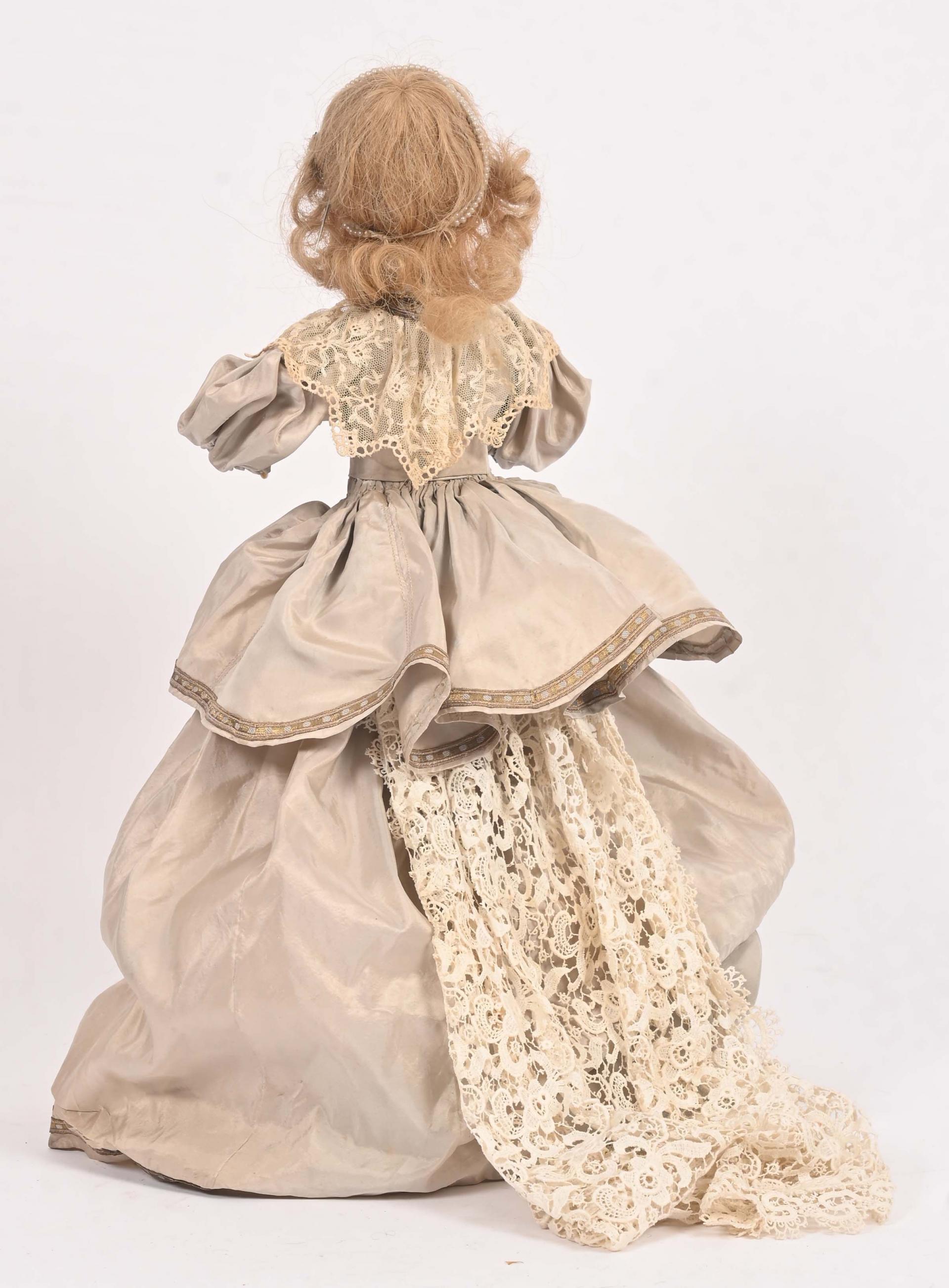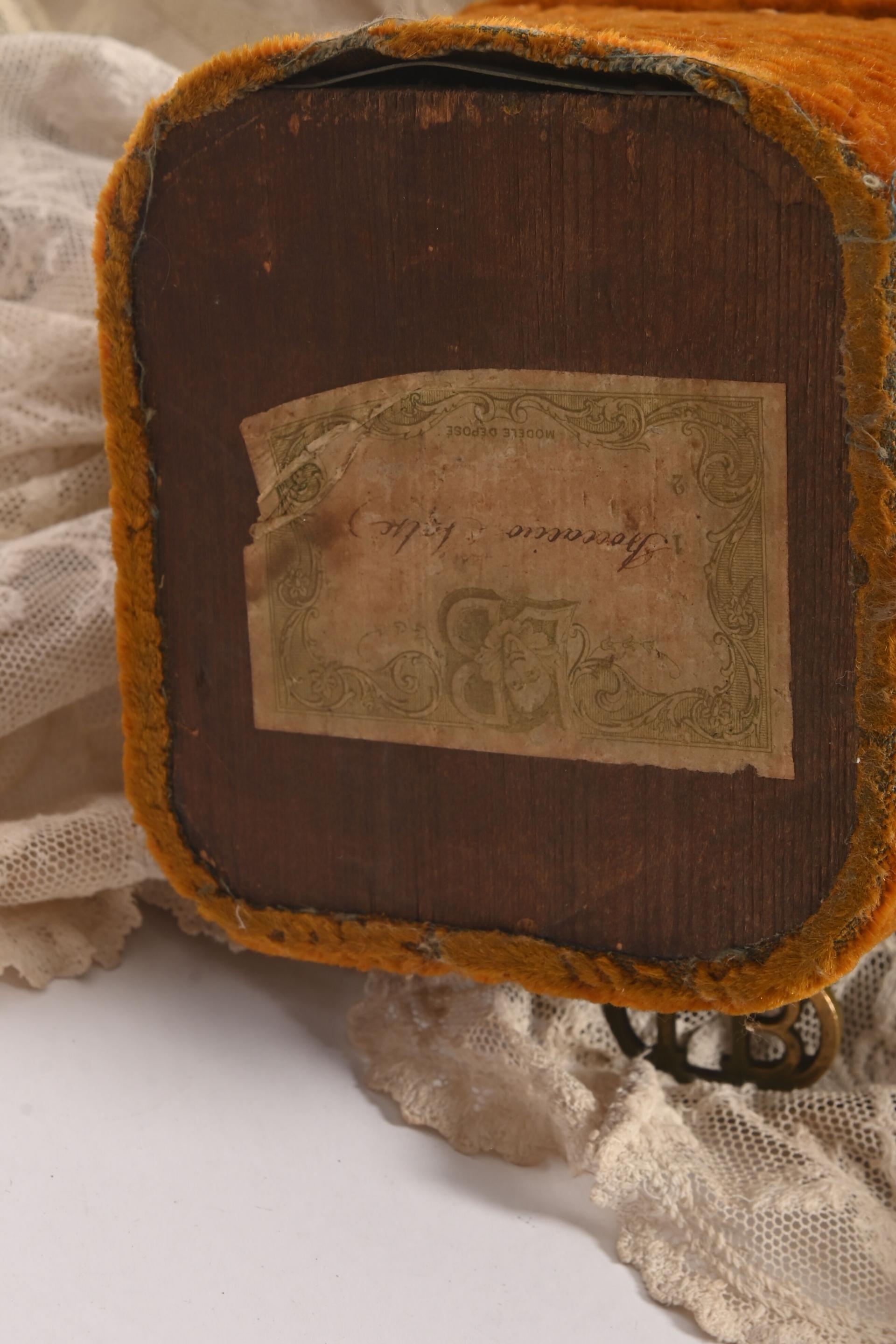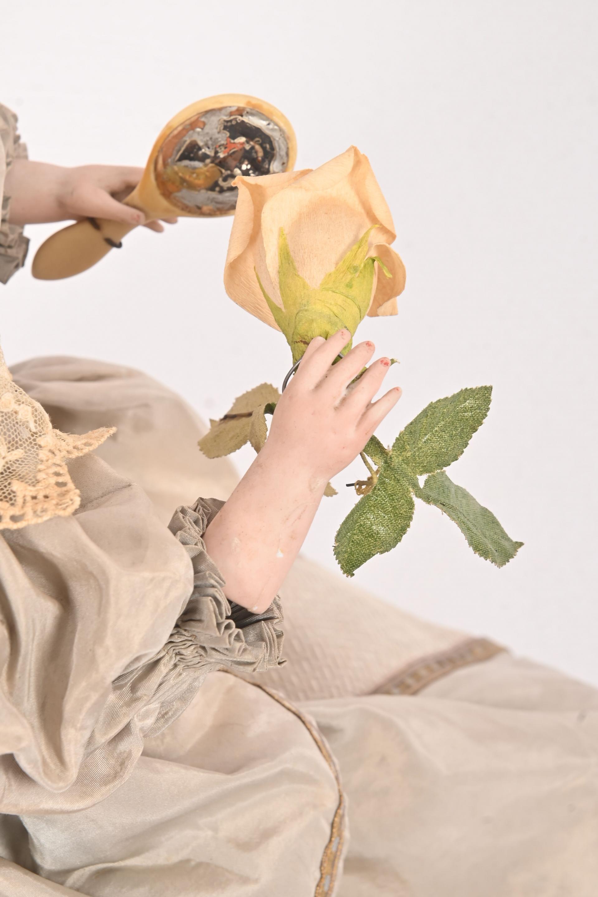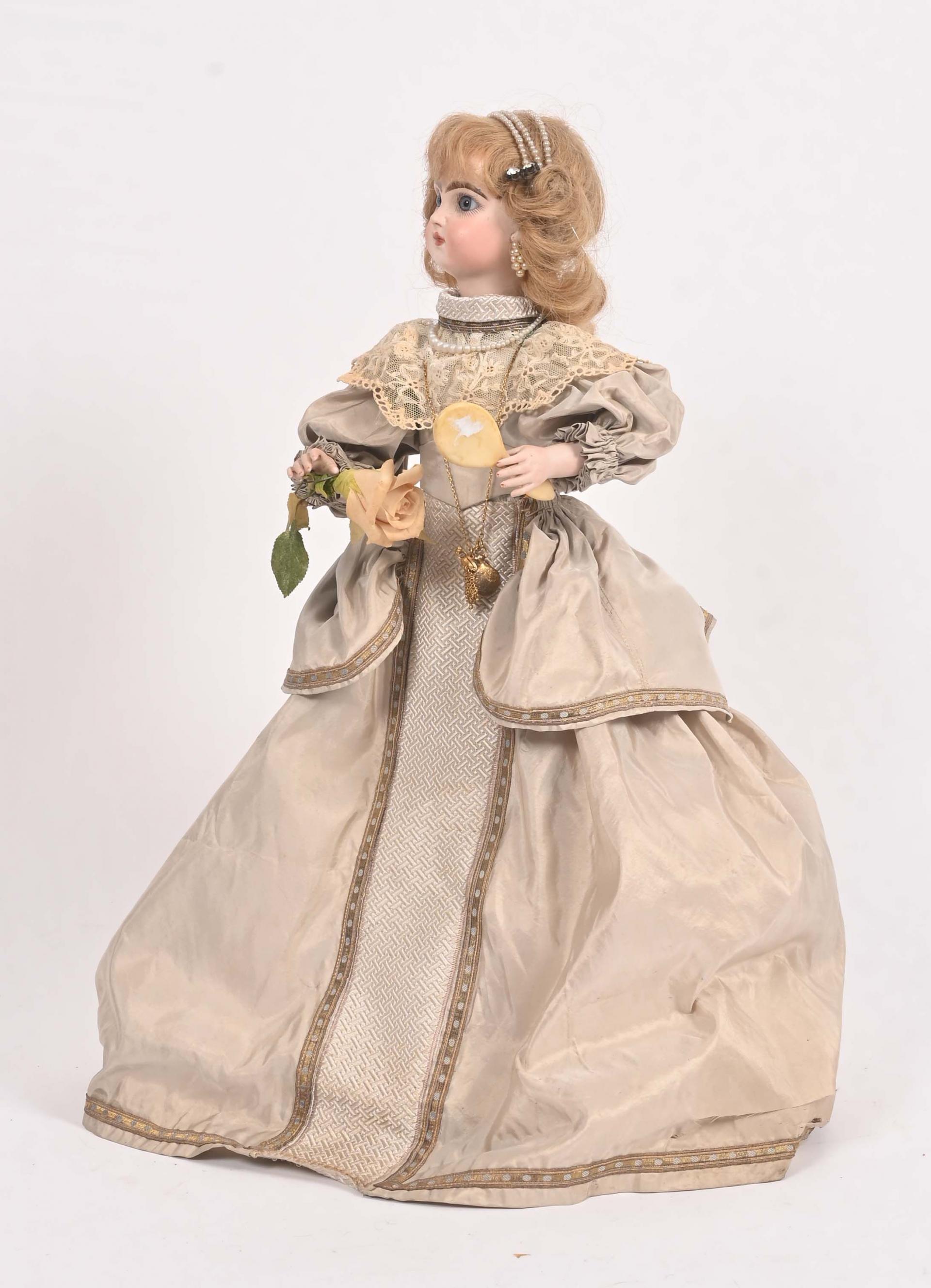 Automate à tête Jumeau, bouche fermée taille 4 marquée au tampon rouge, yeux de sulfure bleu, mains en biscuit (légers accidents à l'une). Beaux mouvements : la tête de gauche à droite et de haut en bas pour sentir la fleur tenue dans la main droite et se regarde dans le miroir tenu dans la main gauche. Mouvement des deux bras. Socle avec mécanisme et musique. Clé LB. Sous-vêtements d'origine, habit refait avec grande robe en soierie, perruque rapportée. H. 50 cm.