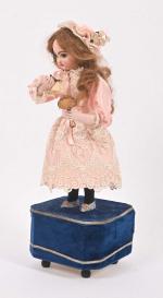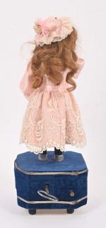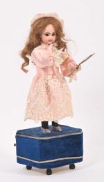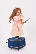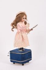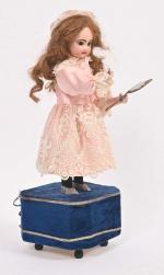 Automate à tête Jumeau, taille 2, bouche fermée, yeux de sulfure marron, mains en biscuit. Elle s'essuie le visage de la main droite, tourne la tête et la baisse pour se regarder dans un miroir tenu dans la main gauche. Rhabillée. Socle regarnie en velours bleu. Musique. H. 45 cm.