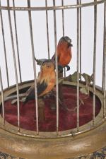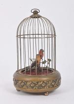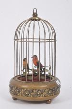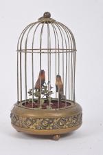 Petite cage à deux oiseaux chanteurs travail étranger vers 1950. Mouvement des oiseaux. Fonctionne. Chant à réviser. H. 25 cm.