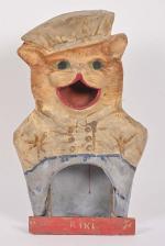 Passe-boule à décor de chat cuisiner en papier mâché peint, (petites usures). H. 56 cm.