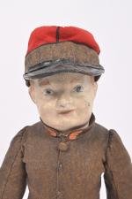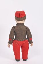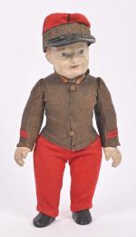 Le soldat, poupon en composition peinte corps semi-articulé, habits militaires en feutre (usures). 40 cm.