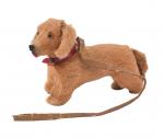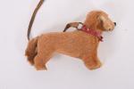 Teckel, petit chien en composition garnie de fourrure, yeux de verre, collier rouge, avec reste de laisse. L. 9 cm.