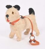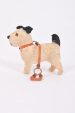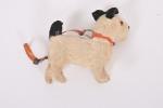 Fox, petit chien en composition garnie de fourrure, yeux de verre, collier orange, avec reste de laisse. L. 7 cm.