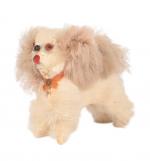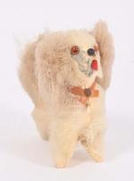 Petit chien en composition garnie de fourrure, yeux de verre, collier orange, (usures). L. 6 cm.