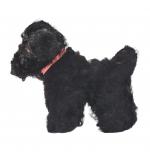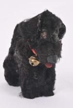 Fox, petit chien en composition garnie de fourrure noire, (manque les yeux), collier rouge avec grelot L. 11 cm.