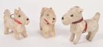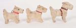 Trois Fox Terrier en peluche, yeux de verre, colliers rouges. Usures. H. entre 7 et 6 cm.