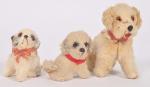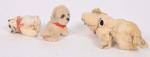 Trois petits chiens assis dont un accidenté, en composition et laine de mouton ou poils de lapin, yeux de verre. H. entre 8 et 5,5 cm.