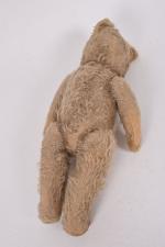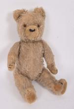 Ours en peluche longue blonde tête pivotante, corps semi-articulé, yeux de verre, (restaurations et usures). 48 cm.