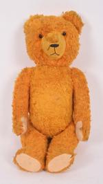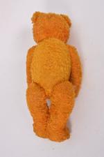 Ours en peluche longue rousse, tête pivotante, corps semi-articulé, yeux de verre, (usures). 47 cm.