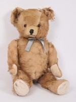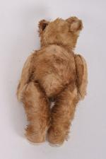 Ours en peluche longue miel, tête pivotante, corps semi-articulé, yeux de verre, (usures et réparations). 51 cm.