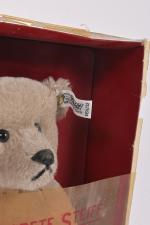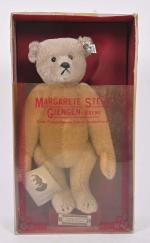 Steiff réédition du 1er ours en peluche grise, yeux en plastique noir, tête pivotante et corps semi-articulé, (usures et salissures). Dans un reste de boîte.