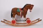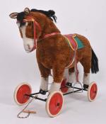 Steiff, cheval à bascule ou roulettes en peluche avec harnachement et mécanisme vocal, vers 1970. H. 66 cm.