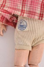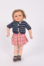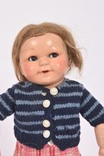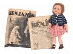 Poupée tête en composition, bouche ouverte avec dents dans le haut, yeux marron dormeurs avec cils regardant vers la gauche, corps tout articulé, habits, perruque. 35 cm. On y joint deux numéros du Journal Benjamin.