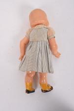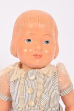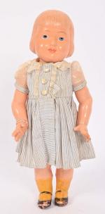 Petitcollin, Jeanne d'Arc Poupée en celluloïd, bouche fermée, yeux bleus peints, chevelure modelée, corps semi-articulé (accident à un pied et fente au visage), habits. 29 cm.