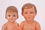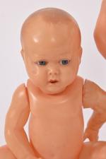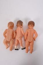 Petitcollin, trois baigneurs en celluloïd, bouche fermée, yeux de verre bleu ou marron, dont Jeanne d'Arc, corps semi-articulé, (usures). Entre 23 et 25 cm.