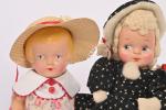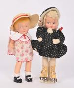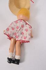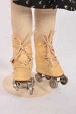 Poupée en composition peinte, bouche fermée, yeux bleus peints, chevelure blonde modelée, habits, chapeau de paille. 31 cm. On y joint une poupée avec patins à roulettes en composition peinte et tissu. 33 cm.