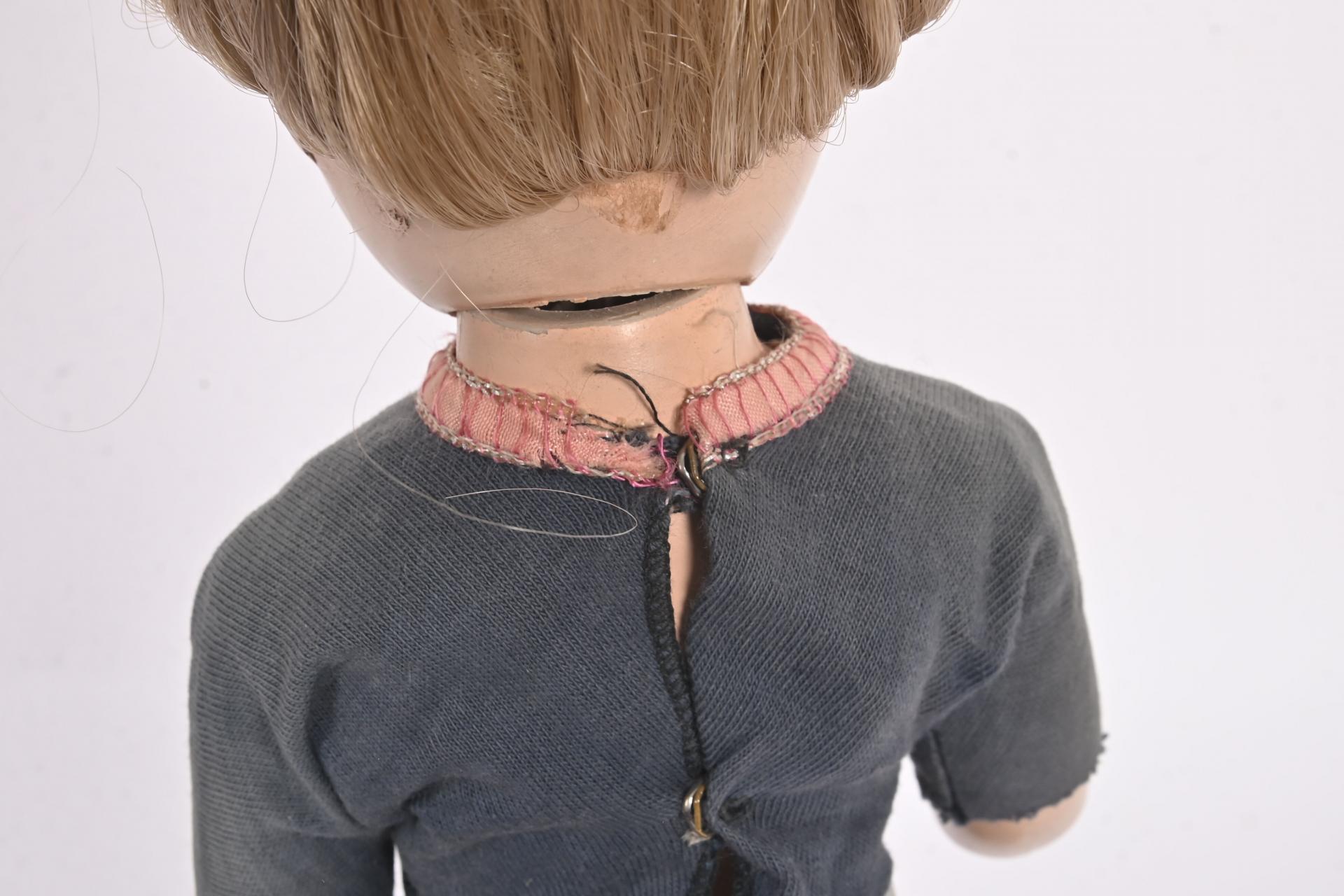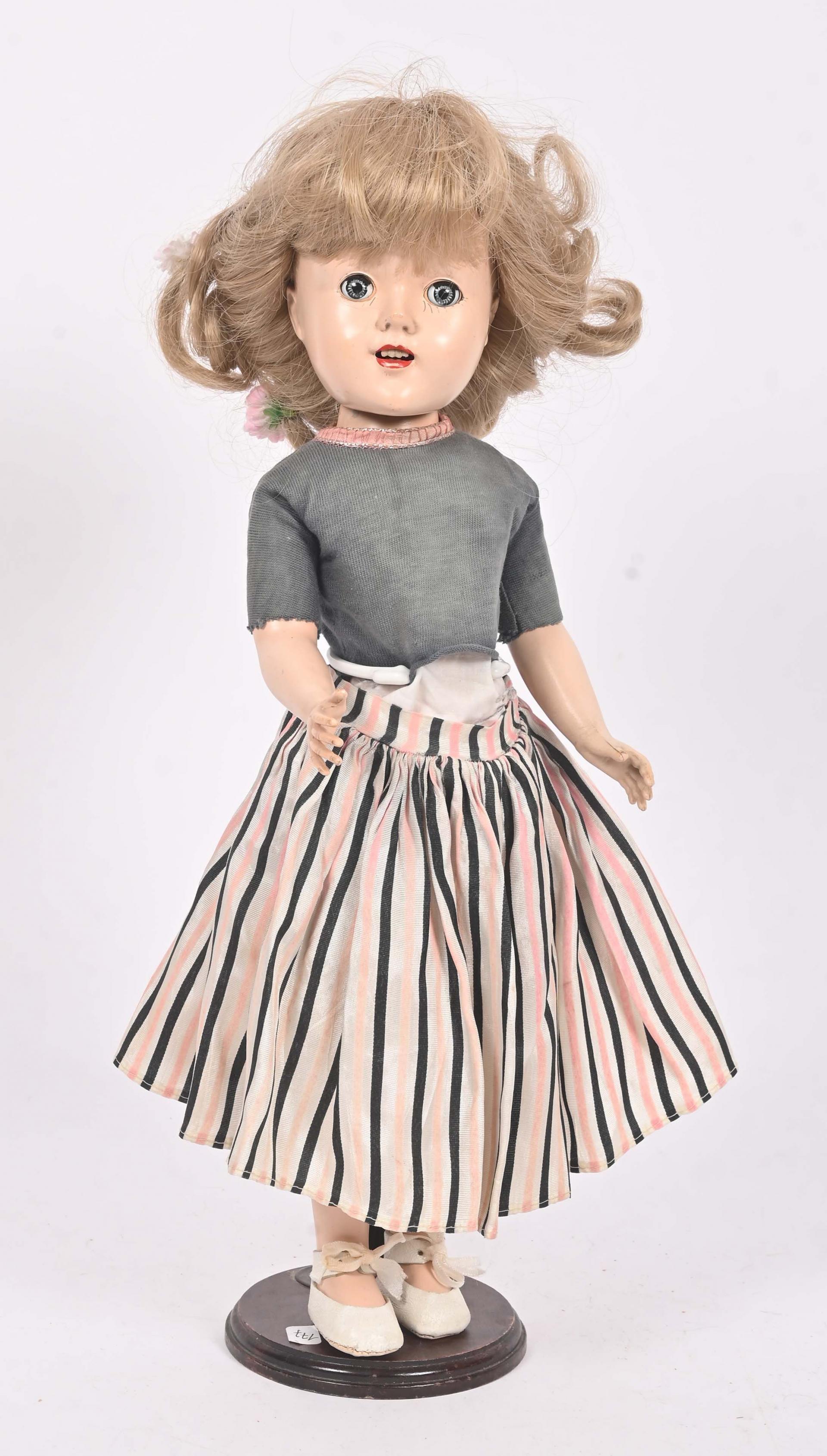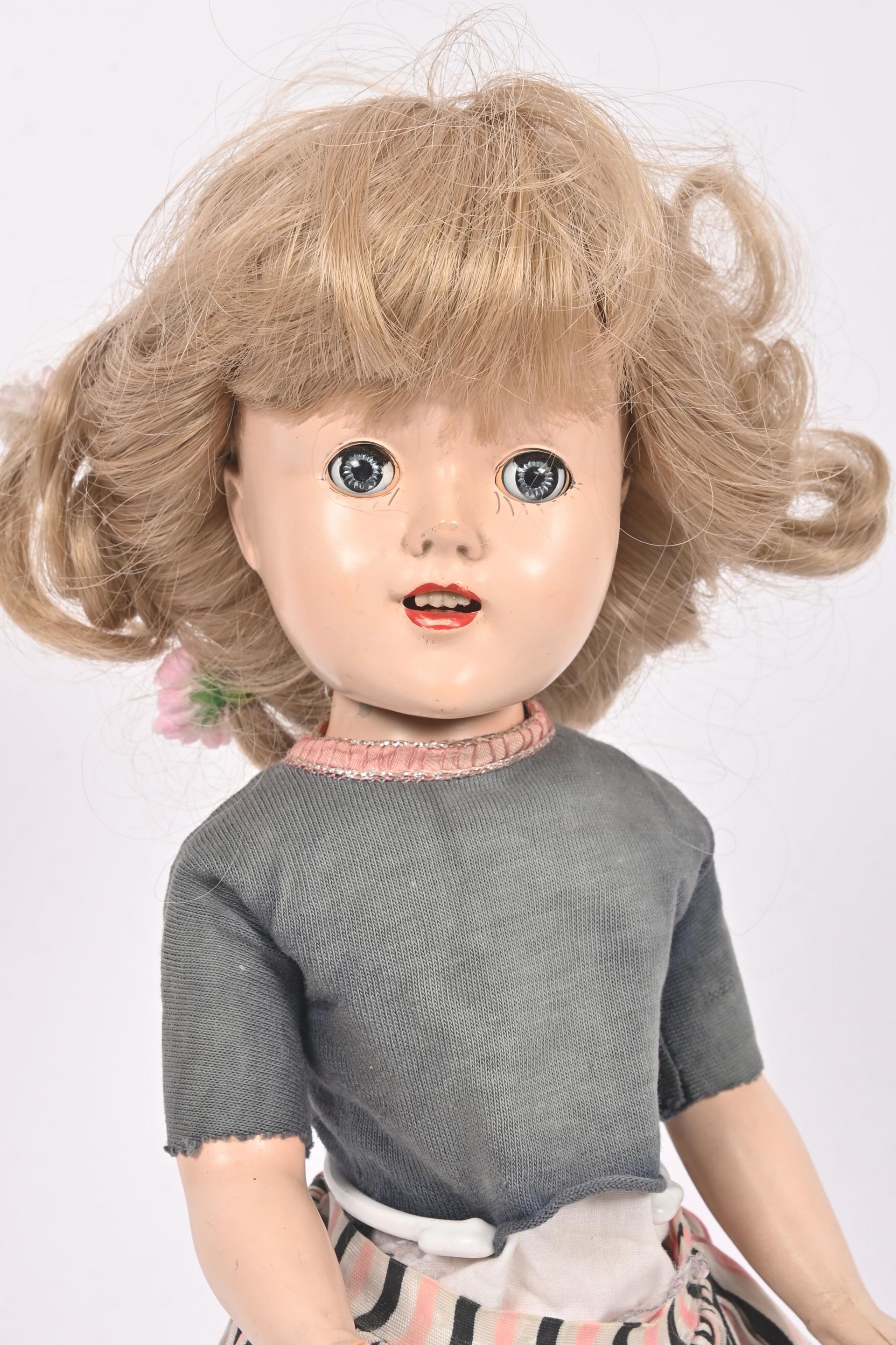 Effanbee, vers 1955 Poupée en plastique dur, bouche ouverte avec dents dans le haut, yeux bleus dormeurs avec cils, (usures au cou et aux lèvres), habits, perruque. 45 cm.