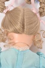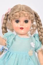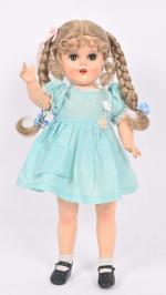 US vers 1950, Raving Beauty Poupée en plastique dur, bouche ouverte-fermée avec deux dents dans le haut, yeux verts dormeurs avec cils, habits, perruque. 48 cm.
