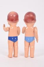 US vers 1950, deux poupées en bakélite bouche fermée, yeux bleus peints regardant sur le côté, chevelures modelées, bras articulés. 19 cm.