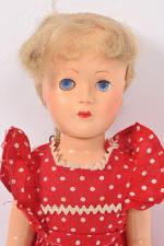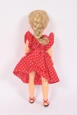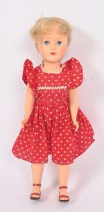 Poupée américaine ? en plastique dur, bouche fermée, yeux bleus dormeurs avec cils, corps marcheur semi-articulé, habits, perruque. 35 cm.