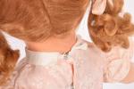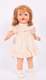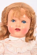 Raynal, poupée en rhodoïd bouche ouverte-fermée avec langue et deux dents dans le haut, yeux bleus dormeurs riboulants avec cils, corps semi-articulé (salissures), habits, perruque. 47 cm.