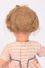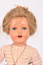 Raynal, poupée en rhodoïd bouche ouverte avec deux dents dans le haut, yeux bleus dormeurs riboulants avec cils, habits, perruque. 42 cm.