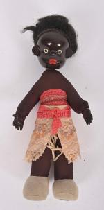 Poupée noire en tissu et feutre bourré tête et mains en celluloïd ou plastique dur, bouche fermée, yeux peints. 35 cm.