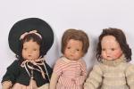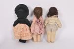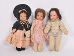 Cottin, trois poupées en tissu et composition peinte, habits, perruques. Entre 38 et 40 cm.