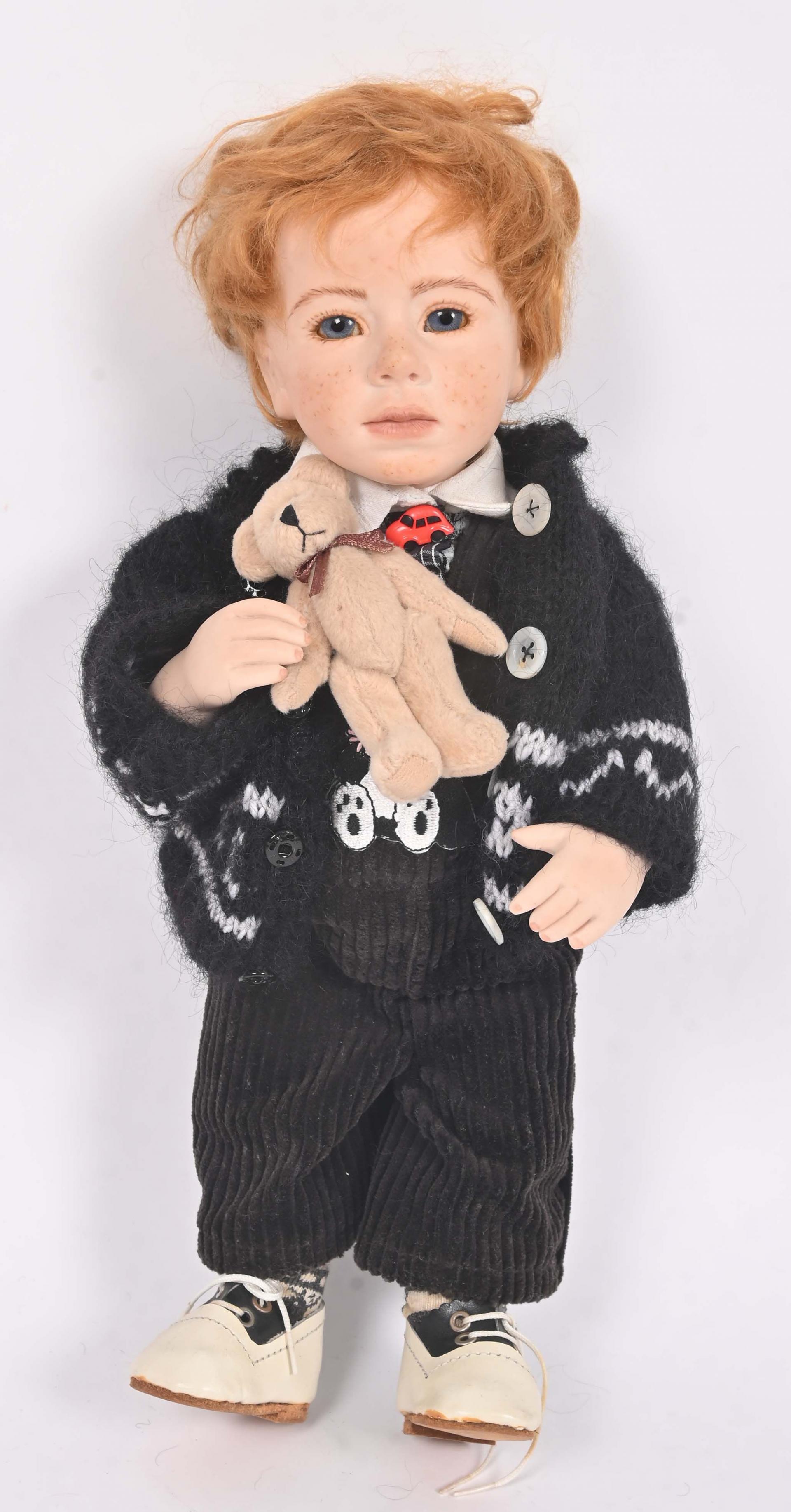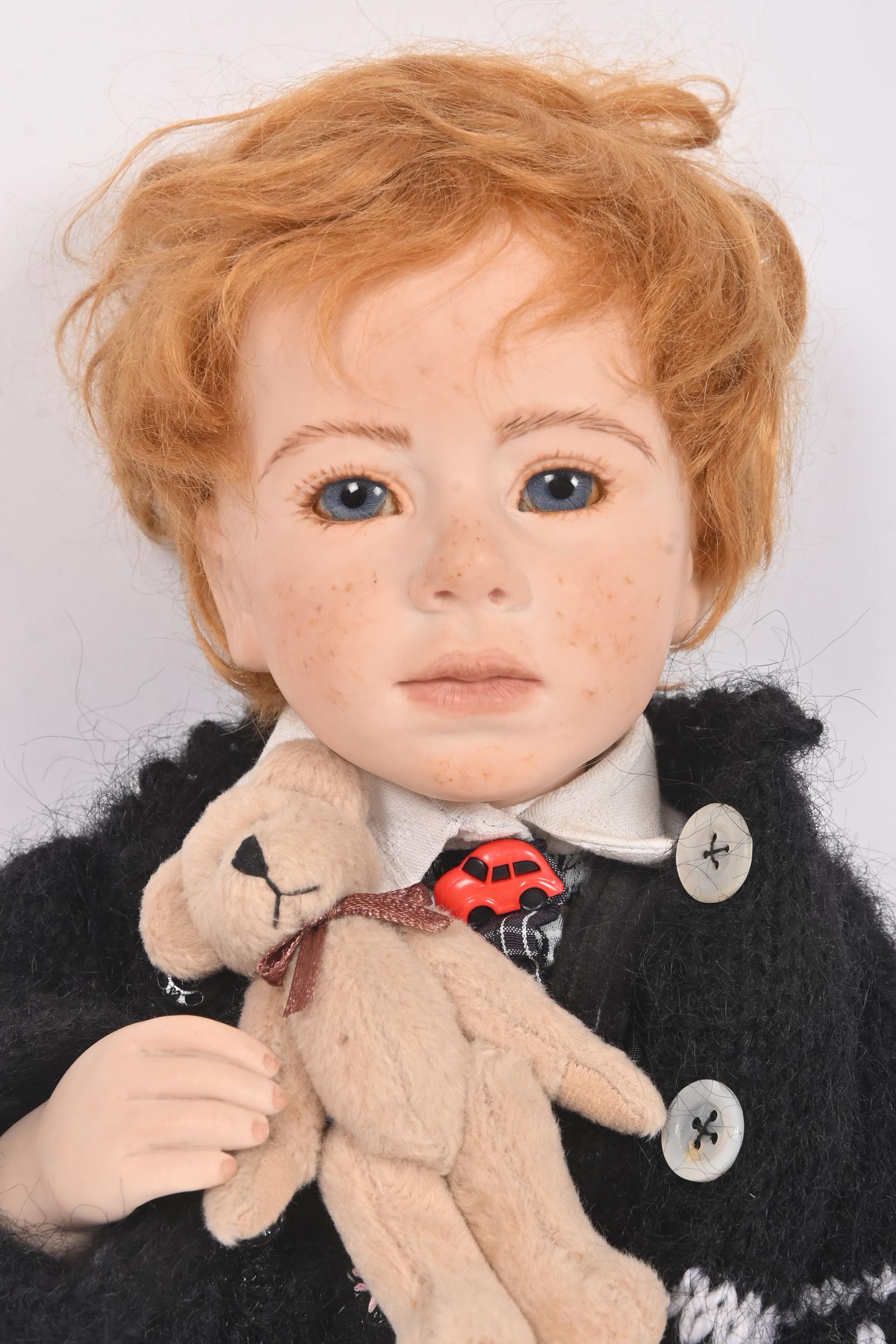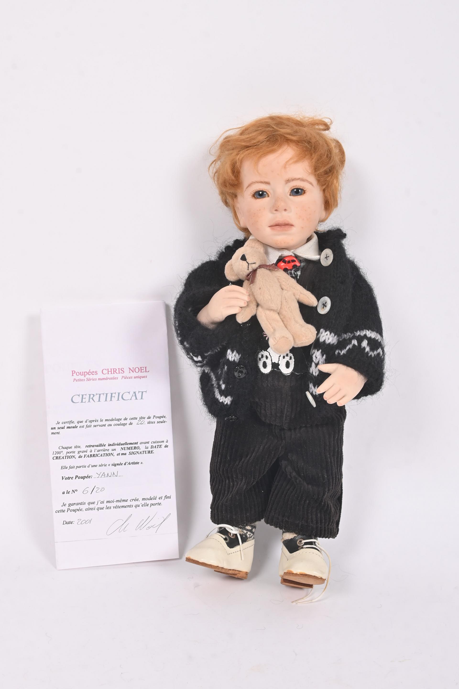 Chris Noël, Yann Poupée en biscuit, numérotée 6/20, bouche fermée, yeux de verre bleu, corps semi-articulé, habits, perruque. Dans une boîte avec certificat. 35 cm.