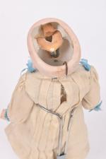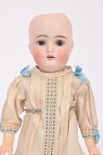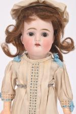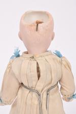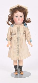 tête en porcelaine allemande marquée en creux "192 5/0", bouche ouverte avec dents dans le haut, yeux marron dormeurs, corps marcheur semi-articulé (fentes et usures), costume ancien, perruque. 24 cm.