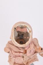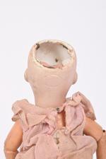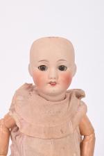 Petite poupée tête porcelaine Unis France moule 301, taille 1, sur un corps tout articulé marqué en creux "1" sur le tronc, habits, perruque. 25 cm.