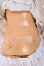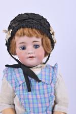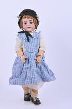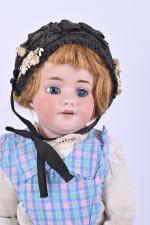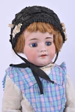 Poupée tête porcelaine Simon & Halbig moule 1039, taille 10 1/2, bouche ouverte avec dents dans le haut, yeux de verre bleu, corps tout articulé (mains non d'origine), habits, chaussures, perruque. 55 cm.