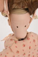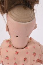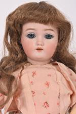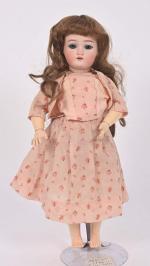 tête porcelaine marquée en creux "Simon & Halbig W.S.K 1", bouche ouverte avec une rangée de dents dans le haut, yeux bleus dormeurs, oreilles percées, beau corps tout articulé, habits d'époque, perruque. 38 cm.