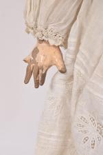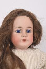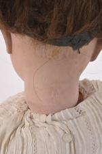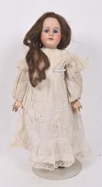 tête porcelaine marquée en creux "Mon Trésor Germany 10", bouche ouverte avec dents dans le haut, yeux de verre bleu, oreilles percées, corps tout articulé (usures et écaillures), sous-vêtements et robe ancienne en coton blanc, perruque. 62 cm.