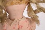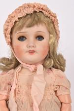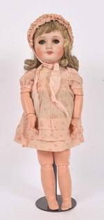 Poupée de la S.F.B.J moule 301, taille 7, bouche ouverte avec dents dans le haut, yeux bleus dormeurs avec cils, corps tout articulé, habits, perruque. 43 cm.