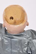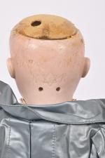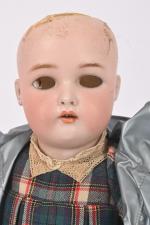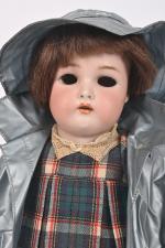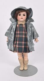 tête porcelaine marquée en creux "Simon & Halbig, "KR" à l'étoile et "46", bouche ouverte avec dents dans le haut, yeux dormeurs (à refixer), oreilles percées, corps tout articulé à boules, habits, perruque. 44 cm.